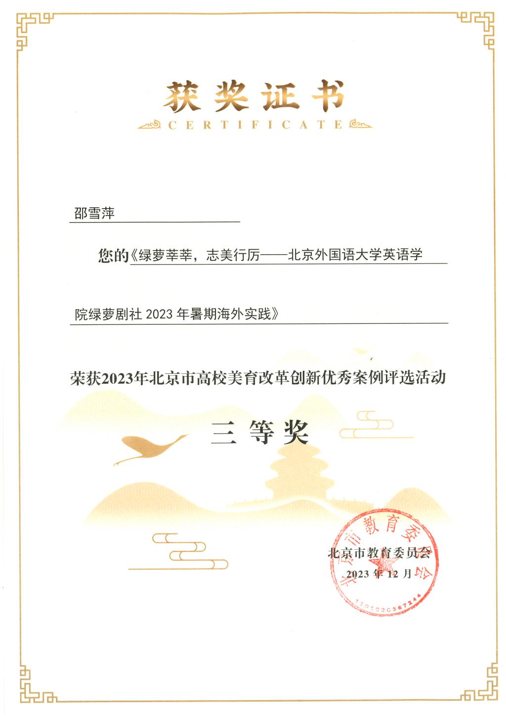 2023年北京市高校美育改革创新优秀案例征集评选活动共征集高校美育案例220余项,有154项案例分获一二三等奖和优秀奖。kaiyun登录中国入口登录邵雪萍博士基于以“学生戏剧社在剑桥大学创新型人才培养中的作用”为主题的考察和演出活动,申报了高校学生艺术社团及实践工作坊建设项目《绿萝莘莘,志美行厉——kaiyun登录中国入口登录绿萝剧社2023年暑期海外实践》,该项目获得2023年北京市美育改革创新优秀案例三等奖。