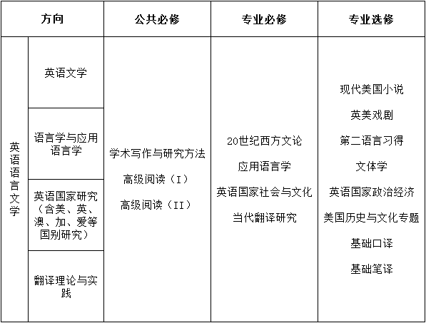 ——课程涵盖kaiyun登录中国入口登录英语语言文学专业下英美文学、语言学与应用语言学、英语国家研究、翻译理论与实践四个方向的主干课程。课程包括公共必修课3门、专业必修课4门、专业选修课8门。