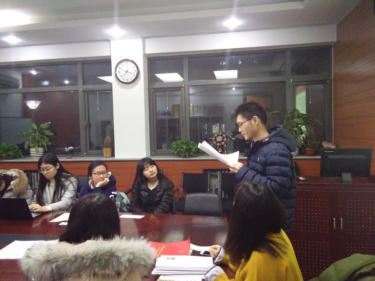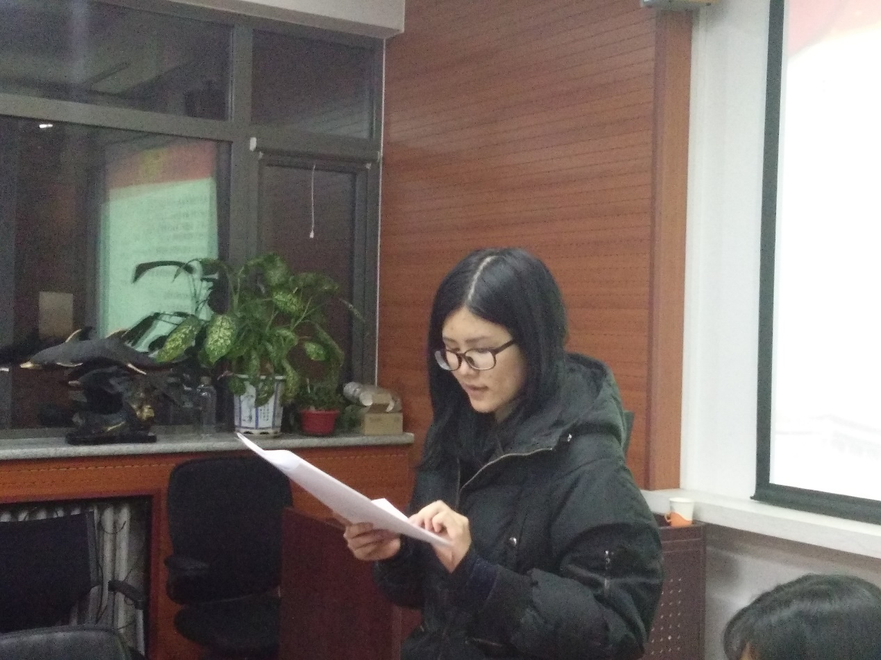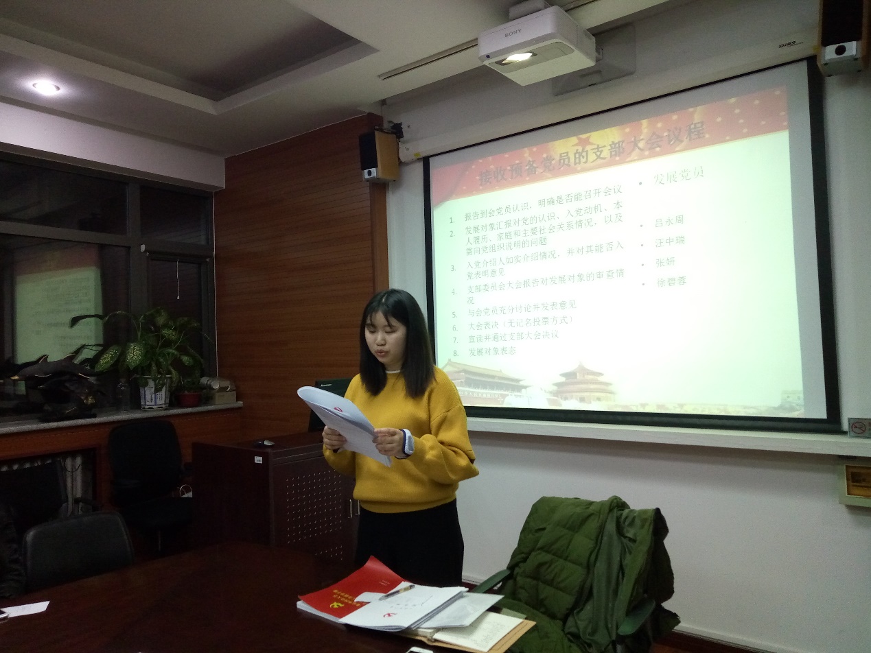 会议伊始,党支部书记卢兴苗同志表示经过长时间的考察,今天终于迎来了接收四位同志为预备党员的大会,随后宣布会议正式开始。首先,2016级语言学硕士研究生吕永周同志宣读自己的入党志愿书;接着其入党介绍人卢兴苗同志、杨婷同志发表意见,表示吕永周同志积极学习党的知识,学习刻苦,群众基础良好,同意推荐其入党;纪检委员宋志远同志报告了对吕永周同志的政治审查情况;接下来与会党员发表意见;最后与会党员进行无记名投票表决。随后,2016级语言学硕士研究生汪中瑞同志、2015级语言学硕士研究生张妍同志、2016级语言学硕士研究生徐碧蓉同志按照上述程序依次进行汇报。汇报结束后,收集与会党员投票结果,纪检委员为计票人,组织委员为监票人,经统计,党支部决定接收吕永周同志、汪中瑞同志、张妍同志和徐碧蓉同志为中国共产党预备党员。