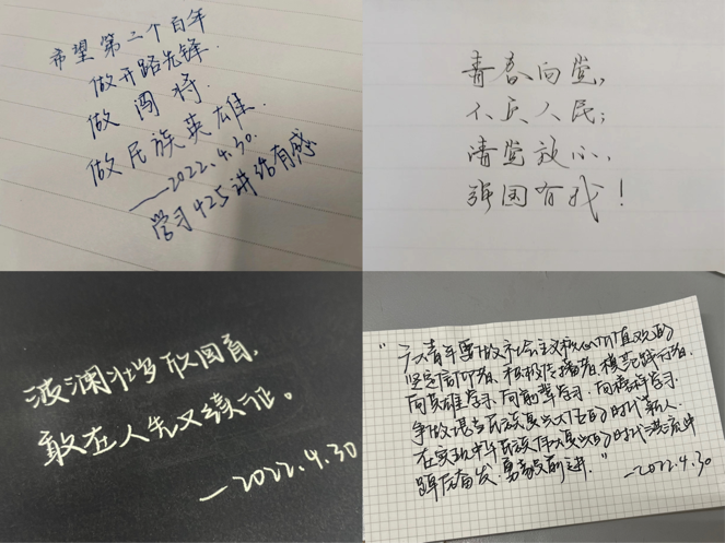作为人大的一名党史专业的学生,需要立足自身专业优势,努力建构自主知识体系,筑牢理想信念之基,并以目前正在辅修的英语为媒介,讲好中国特色、中国风格、中国气派的故事,争做“国民表率,社会栋梁”。同时我还要继续提高自己的政治站位,切实将习近平重要讲话精神内化于心,外化于行,以实际行动迎接党的二十大胜利召开!
