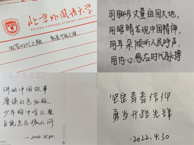 作为“国传班”的一员,我们承担着“点亮一盏灯,照亮一大片”的职责,带动身边的北外同学一起为中华民族伟大复兴添砖加瓦,这是我们的光荣使命。我们要不断提升理论素养,当好“宣讲员”,把党的理念正确、及时传达到身边同学心中。作为中国青年群体的代表,应该坚信“真理越辩越明”,要敢于和错误言论作斗争,增强理论素养,苦练内功心法,把党的故事讲好、讲深、讲透,让新时代的奋斗精神入脑入心。我们要始终牢记习近平总书记对当代青年的殷殷嘱托,立志民族复兴,在青春的赛道上奋力奔跑,做社会主义核心价值观的坚定信仰者、积极传播者、模范践行者,向英雄学习、向前辈学习、向榜样学习,争做堪当民族复兴重任的时代新人,在实现中华民族伟大复兴的时代洪流中踔厉奋发、勇毅前进。