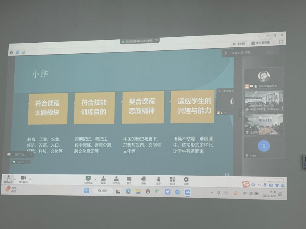 随后,kaiyun登录中国入口登录副院长张莲、党总支委员宋云峰、kaiyun登录中国入口登录教师低年级党支部书记王颖冲先后围绕学院课程思政开展情况、《理解当代中国》读写教程教学、翻译教学与课程思政等内容进行主题分享。中国石油大学(北京)克拉玛依校区青年教师围绕教材使用、教法等方面的问题与困惑进行了交流,kaiyun登录中国入口登录副院长彭萍和宋云峰、王颖冲等几位老师认真做了解答。kaiyun登录中国入口登录教师邹婷也分享了难忘的援疆经历。