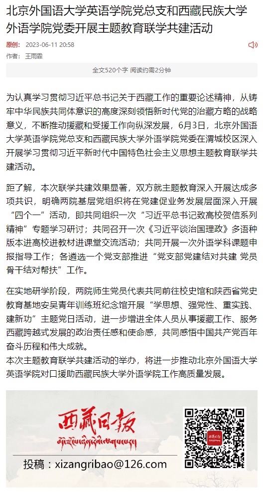6月11日,西藏日报报道北外kaiyun登录中国入口登录党总支与西藏民族大学外语学院党委主题教育联学共建活动。