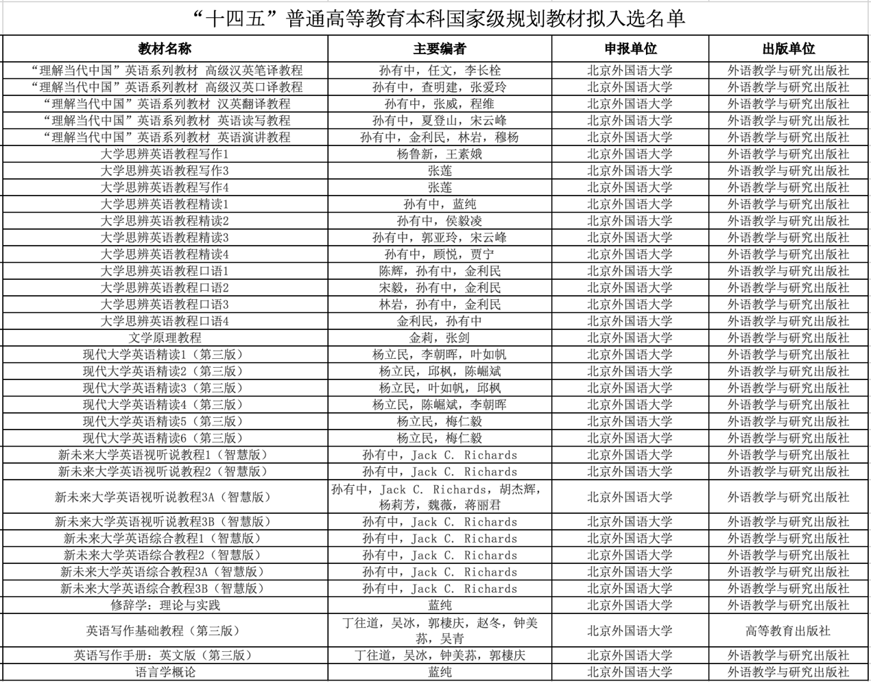 kaiyun登录中国入口登录35册教材拟入选“十四五”普通高等教育本科国家级规划教材,其中包括孙有中教授等主编的《“理解当代中国”英语系列教材》,杨鲁新、张莲、孙有中教授等主编的《大学思辨英语教程》系列教材,杨立民教授等主编的《现代大学英语》系列教材,在学校各语种拟入选教材中名列前位。