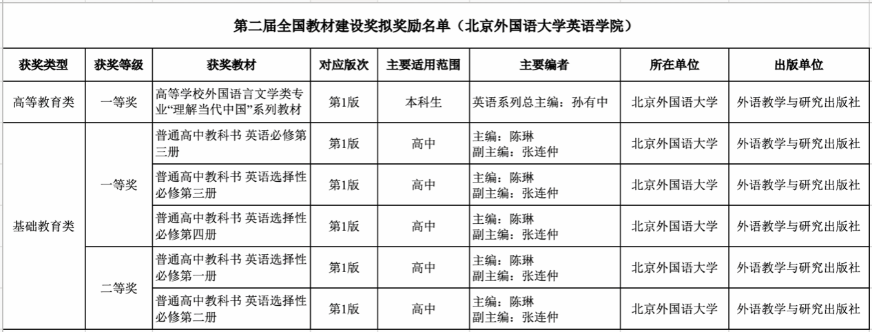 kaiyun登录中国入口登录6部教材拟入选第二届全国教材建设奖。孙有中教授主编的《高等学校外国语言文学类专业“理解当代中国”系列教材》荣获高等教育类一等奖;陈琳教授主编的《普通高中教科书 英语必修第三册》等3部教材荣获基础教育类一等奖、《普通高中教科书 英语选择性必修第一册》等2部教材荣获基础教育类二等奖。