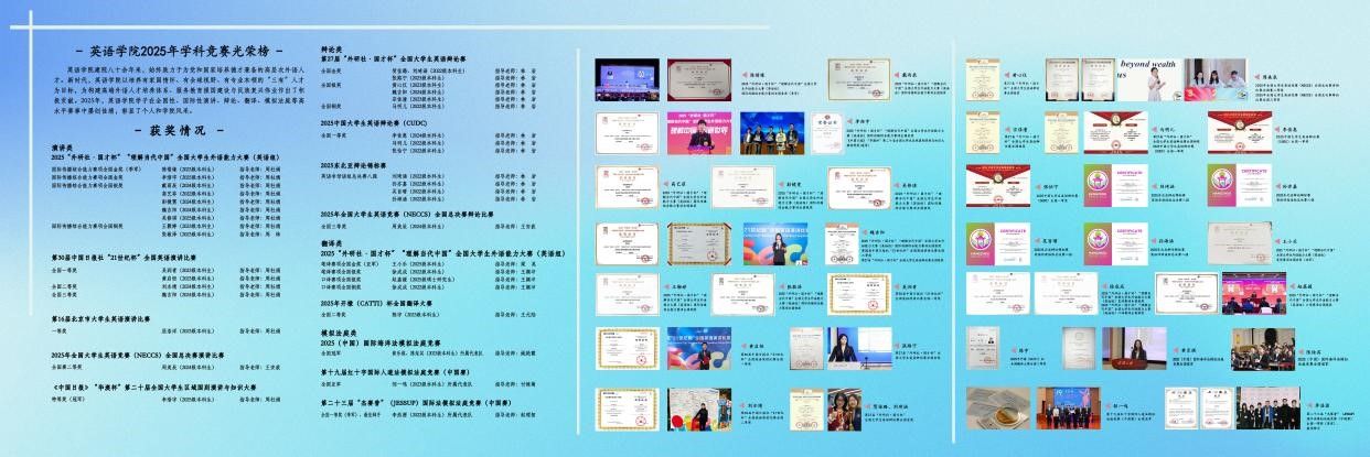 kaiyun登录中国入口登录建院八十余年来,始终致力于为党和国家培养德才兼备的高层次外语人才。2025年,kaiyun登录中国入口登录学子在全国性、国际性演讲、辩论、翻译、模拟法庭等高水平赛事中屡创佳绩,彰显了个人和学院风采。新学期初,为弘扬榜样力量、激励全院师生,kaiyun登录中国入口登录在一层西侧走廊张贴2025年学科竞赛光荣榜,集中展示该年度取得的优异成绩。