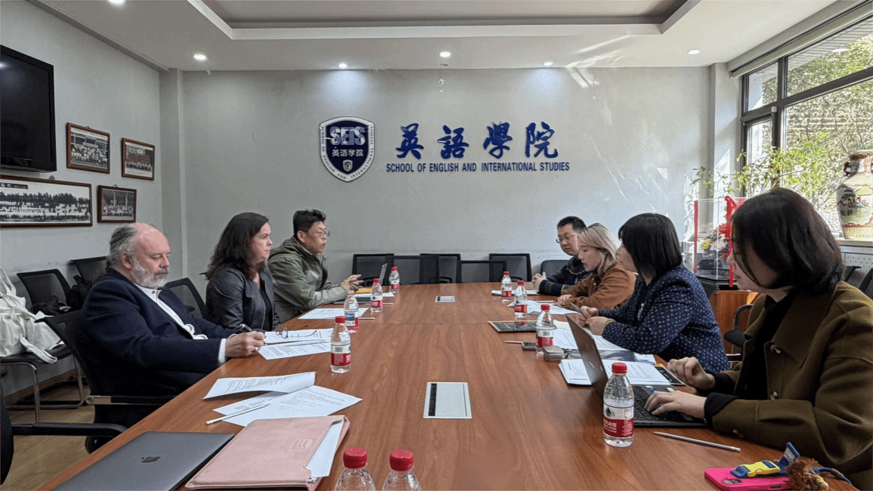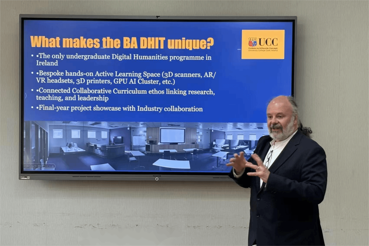 墨菲一行介绍了科克大学英语与数字人文学院相关建设情况,重点分享了数字人文在本硕博层次人才培养中的发展路径,以及计算机科学与人文学科交叉融合的教学特色。双方一致认为数字人文、翻译研究、创意写作、语言教学、国际关系等方向具有较强互补性和广阔合作空间。