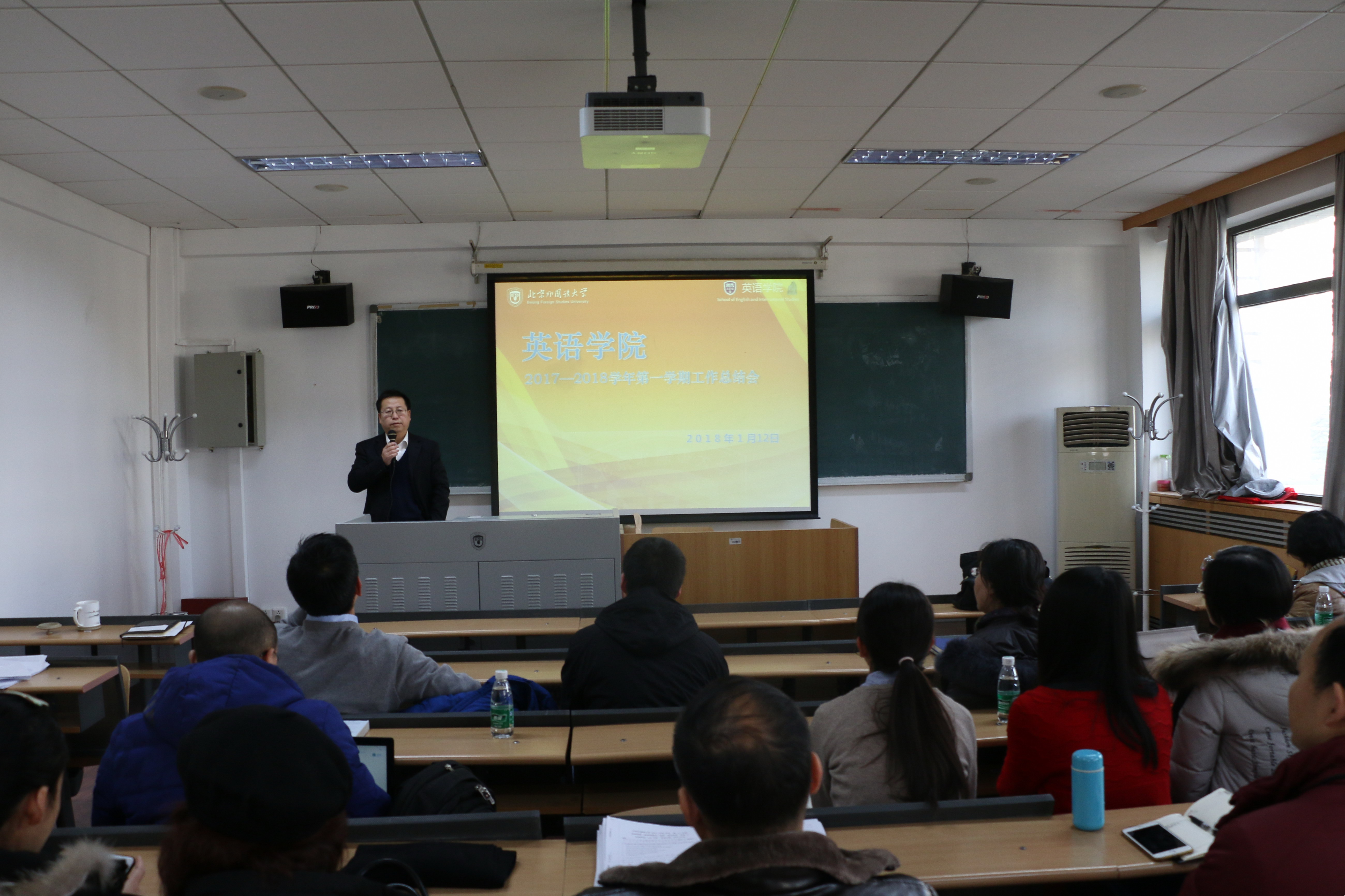 ——分管本科教学工作的副院长张莲教授就本科教学任务完成情况,教学研讨、管理与监控,迎接本科教学工作审核评估,写作、语音辅导中心建设及运行,第二轮学科方向课立项,本科教学改革立项审核,2018年本科教育教学改革专项申报,组织辅导参加第二届全国高等院校英语教师教学基本功大赛,本科常规管理工作,以及确定下学期开课计划等方面做了全面总结。