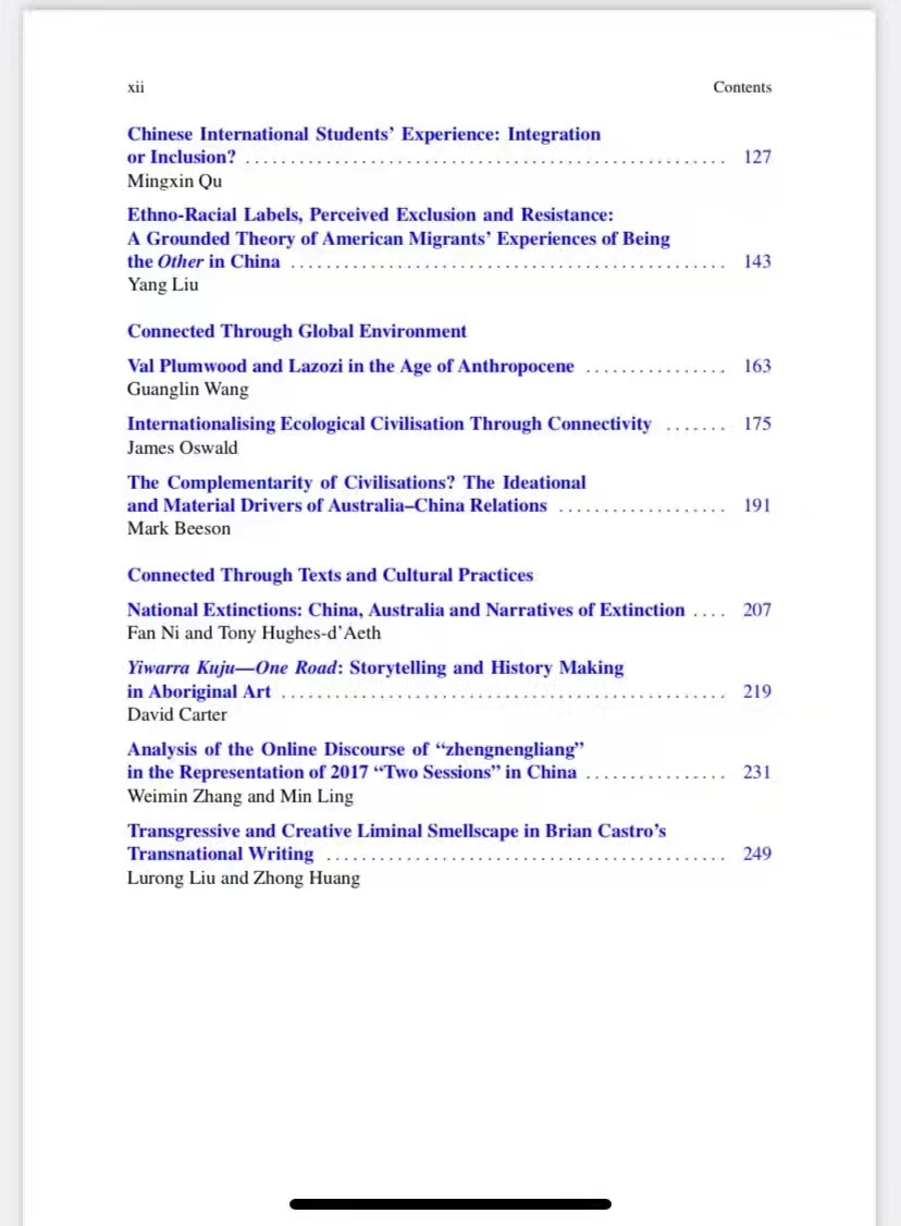论文集延续了Springer出版社“Encounters between East and West: Intercultural Perspectives”系列的关注点,围绕“Transcultural Connections:Australia and China”(中澳跨文化联系)的主题,集结出版了2019年CATS会议期间的优秀论文及部分特邀稿件,由Greg McCarthy教授、孙有中教授、Xianlin Song副教授主编。kaiyun登录中国入口登录刘杨博士、胡丹博士与澳研中心研究生文馨供稿。