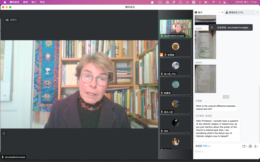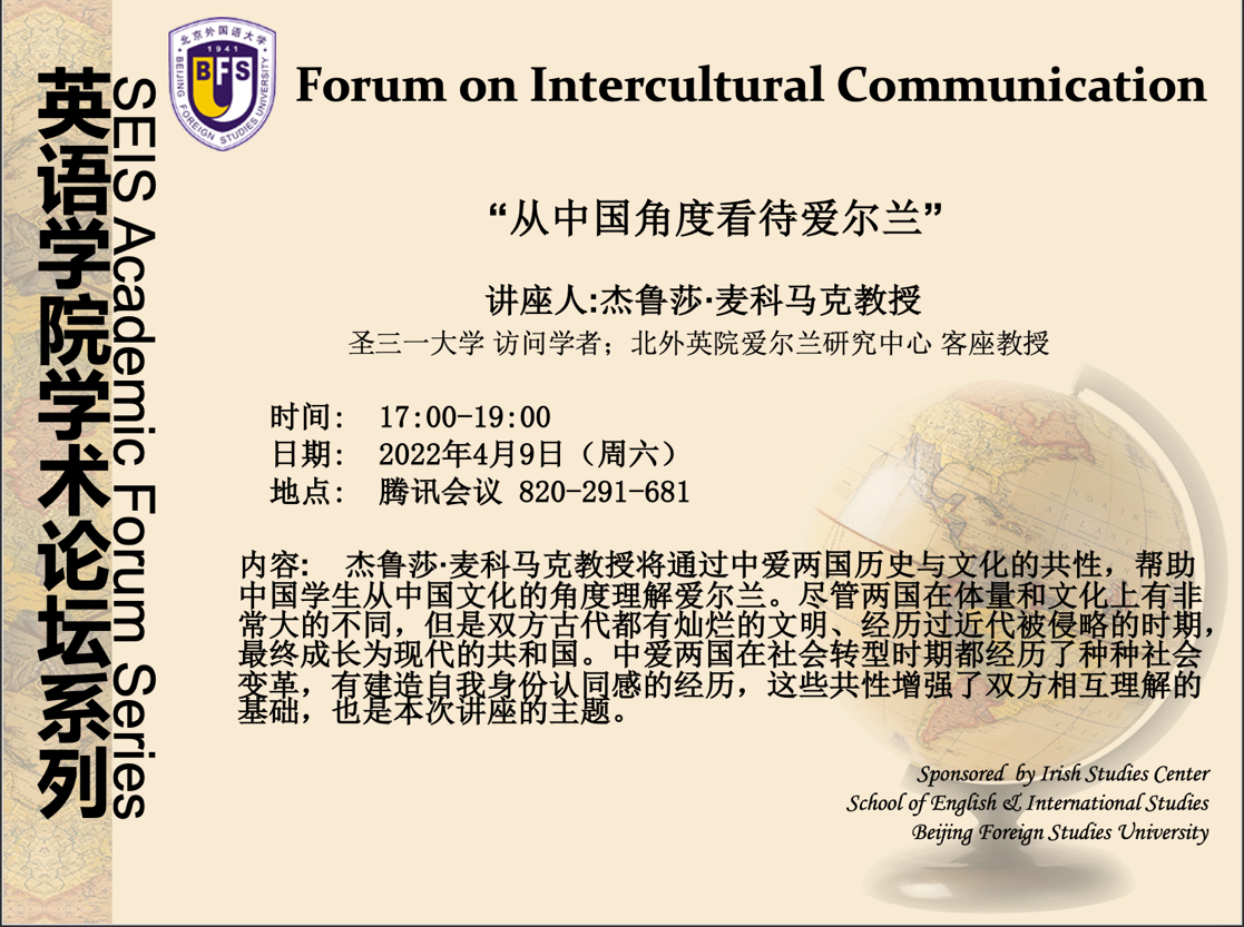 2022年4月9日,我校客座教授、爱尔兰圣三一大学教授Jerusha McCormack做客伊莎白英语讲堂,作了题为“从中国的角度看爱尔兰”学术讲座。讲座由北外kaiyun登录中国入口登录爱尔兰研究中心主任王展鹏教授主持。陈丽教授、张珺涵、爱研学生、其他院系对爱尔兰有兴趣的学生、以及校外师生等170余人参与了本次讲座。