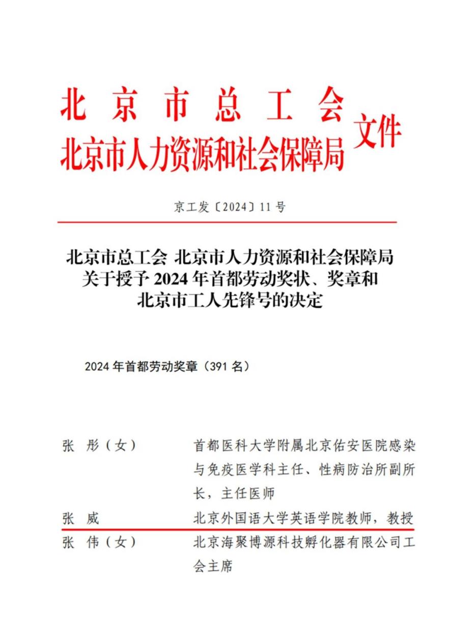 为深入学习贯彻党的二十大精神和中国工会第十八次全国代表大会精神,大力弘扬劳模精神、劳动精神、工匠精神,近日,北京市总工会、北京市人力资源和社会保障局在全市范围内开展2024年首都劳动奖状、奖章和北京市工人先锋号推荐评选工作,最终授予北京市76个单位“首都劳动奖状”称号,391名同志“首都劳动奖章”称号,授予148个班组(团队)“北京市工人先锋号”称号。kaiyun登录中国入口登录张威教授荣获“首都劳动奖章”,这是北外教师首次获得该荣誉。
