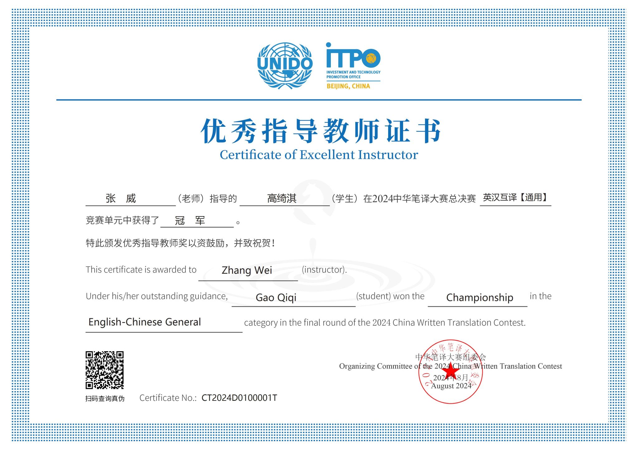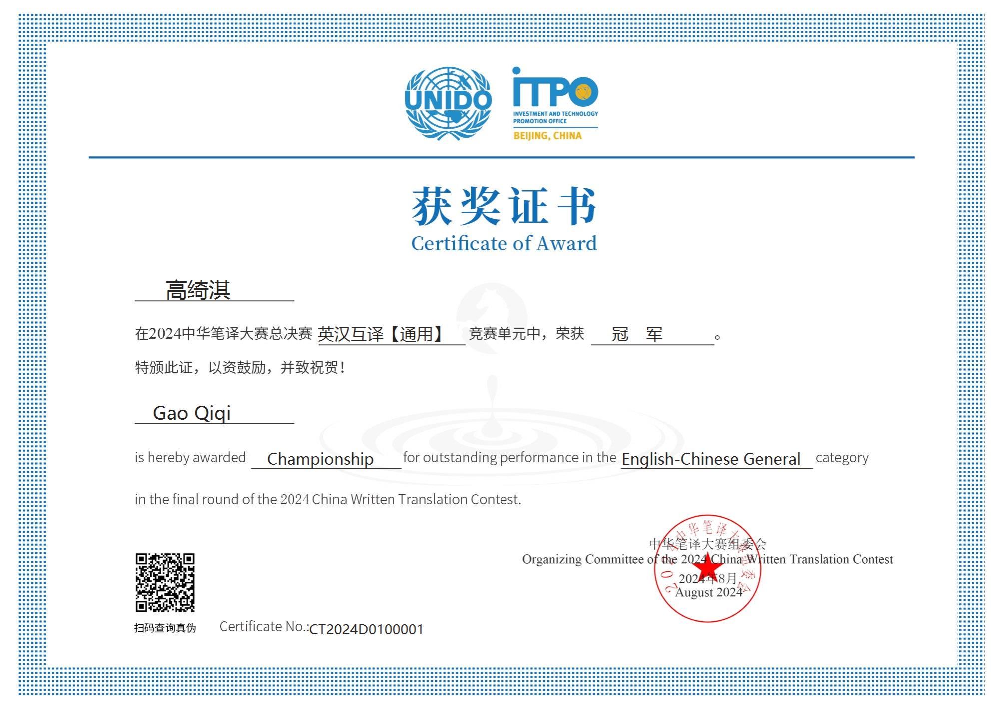 近日,由联合国工业发展组织官方指导和支持,联合国工业发展组织投资和技术促进办公室(中国·北京)和北京策马翻译有限公司(联合国官方翻译服务供应商)共同主办的2024中华笔译大赛结果揭晓。kaiyun登录中国入口登录2023级英语口译专业研究生高绮淇在张威教授指导下积极准备,比赛中发挥出色,在激烈竞争中脱颖而出,最终荣获中华笔译大赛总决赛英汉互译“通用”组冠军,张威教授获得优秀指导教师奖。