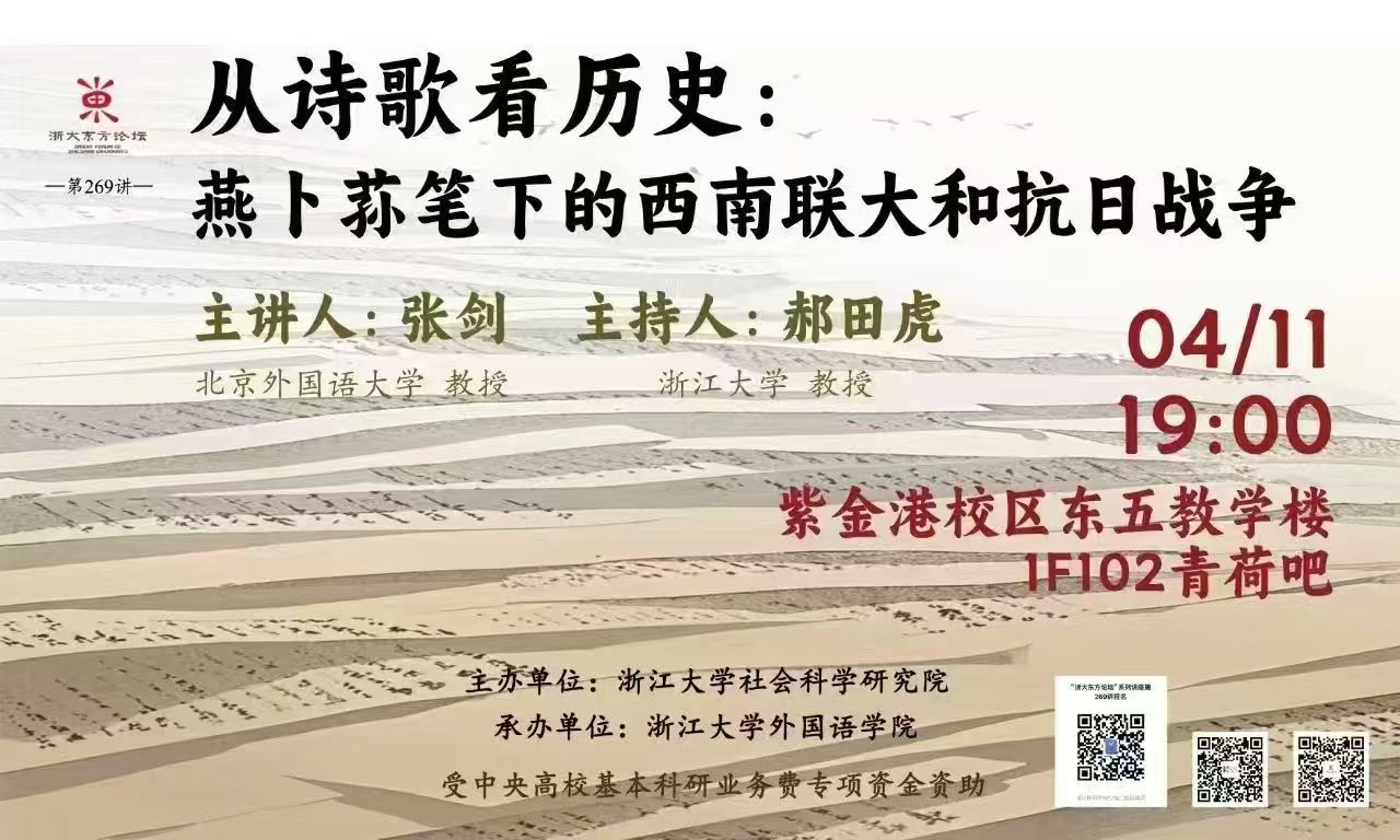 2025年4月11日晚,kaiyun登录中国入口登录张剑教授受浙江大学外国语学院邀请在“浙大东方论坛”做主讲嘉宾。讲座主题为“从诗歌看历史:燕卜荪笔下的西南联大和抗日战争”。