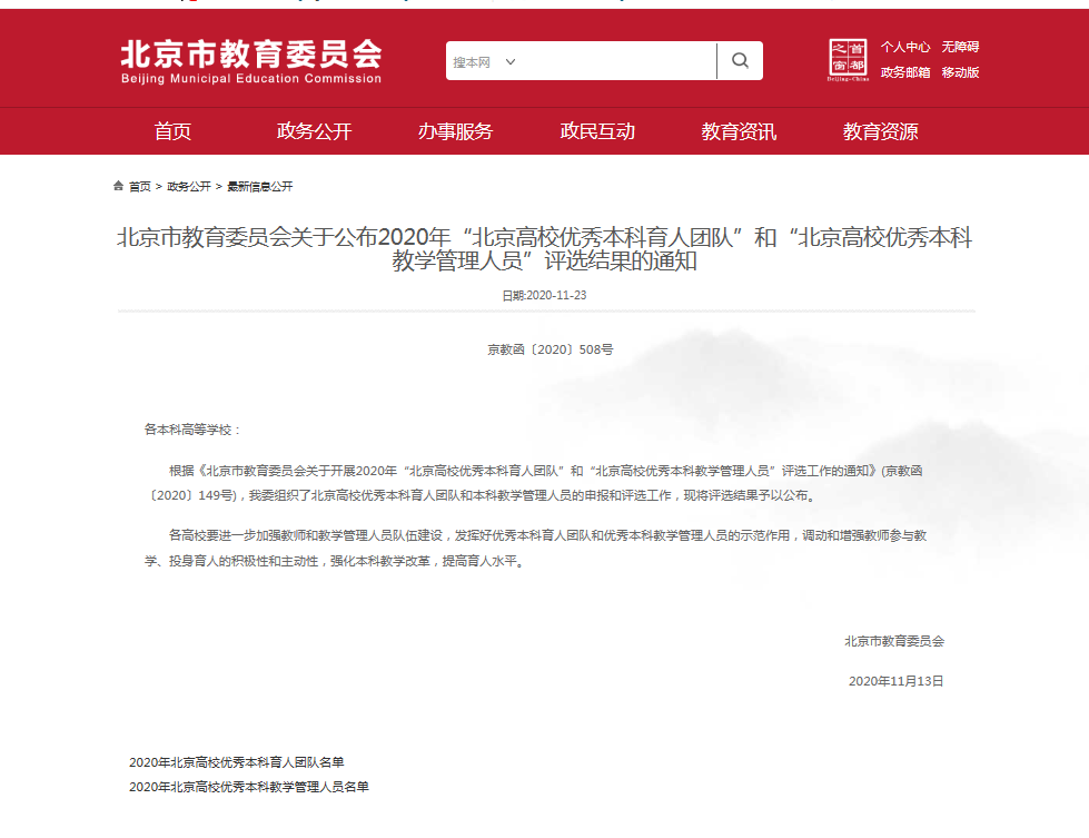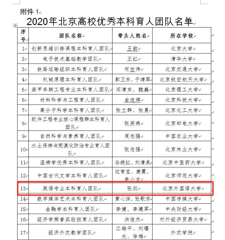 近日,北京市教育委员会公布2020年“北京高校优秀本科育人团队”评选结果。我院英语专业本科教学团队获评“北京高校优秀本科育人团队”。