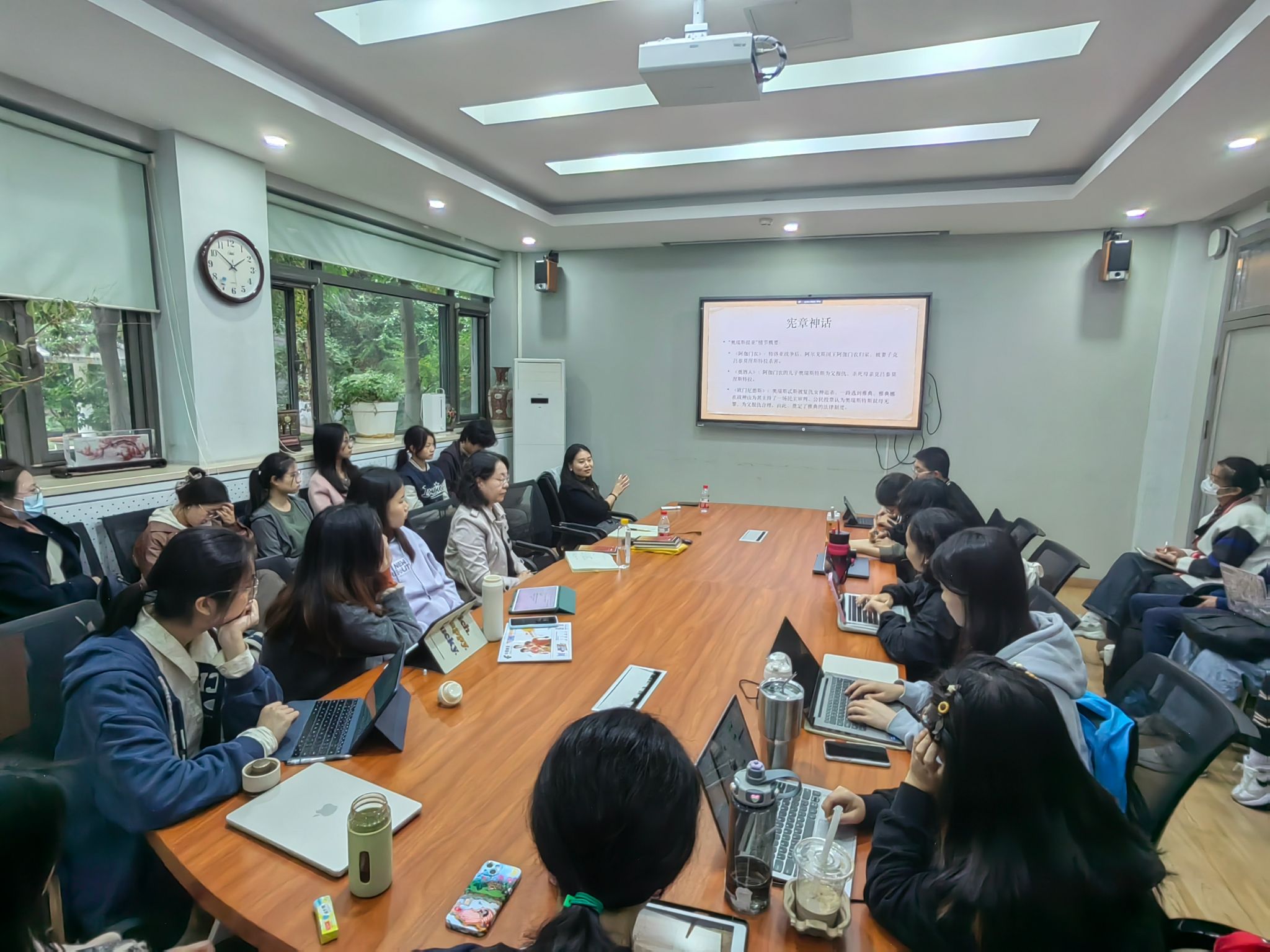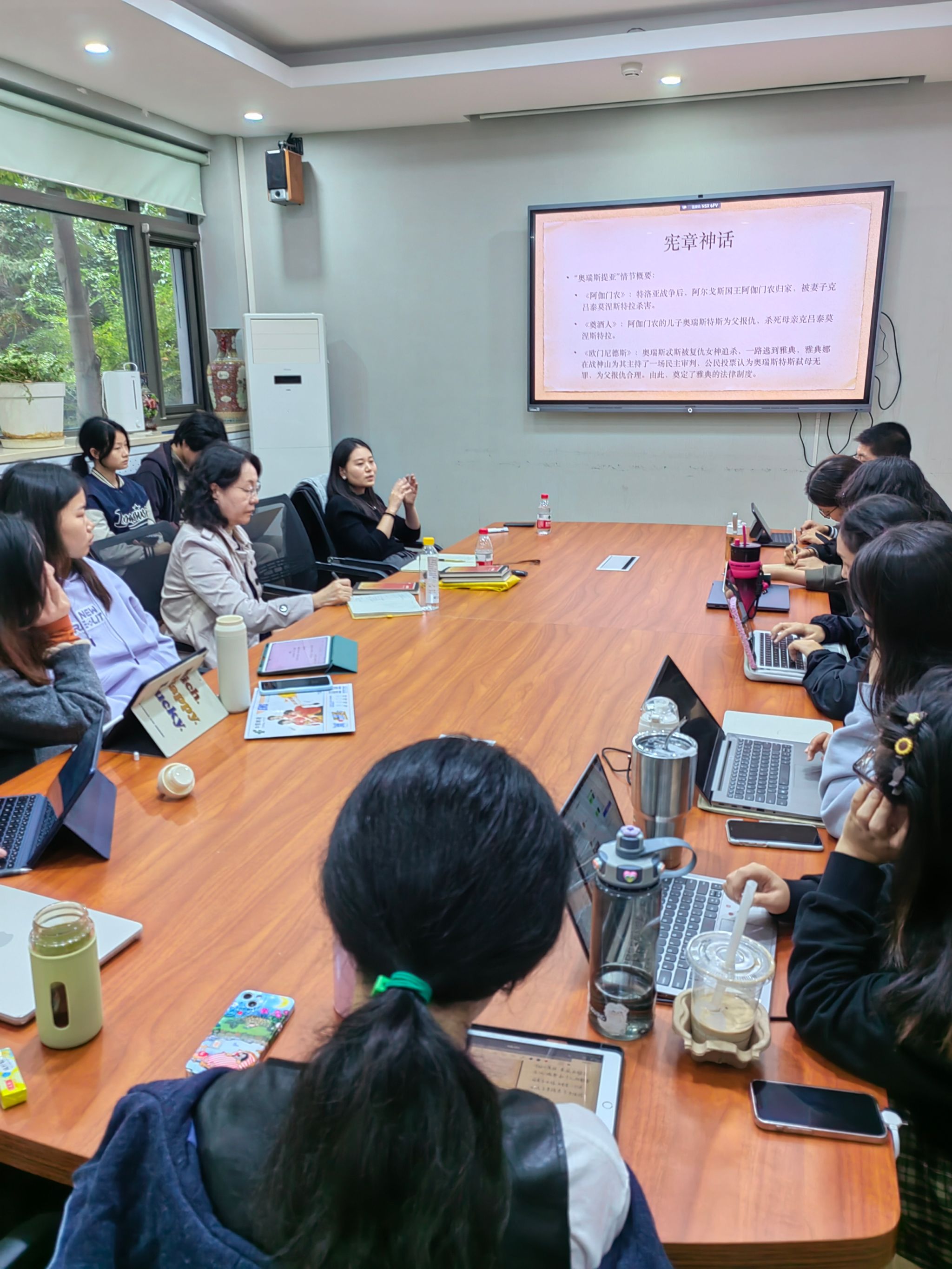 颜荻老师的讲座分析《奥瑞斯提亚》中的城邦与文明的主题,并与听众一同进入古希腊城邦与宪法构建的神话起源时刻,共同探讨剧中所涉及的起源、法律、家庭、性别等问题,重新审视了古希腊戏剧作品与其处历史文化语境间的关系,极具启发性。在提问环节,颜荻老师与参加讲座的师生展开热烈的交流与互动,对与会师生提出的问题一一进行了深入解答。
