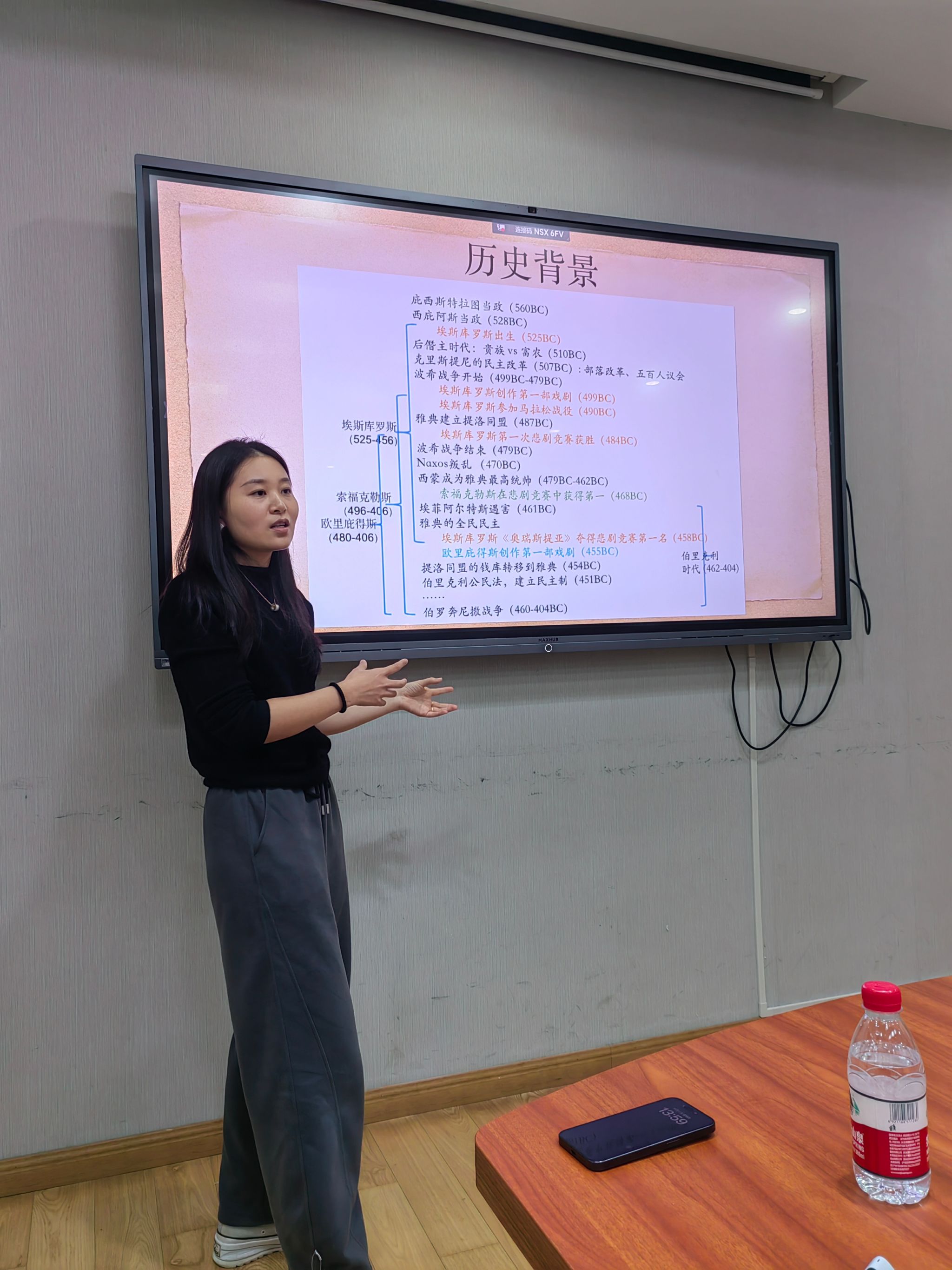 颜荻博士的讲座首先对希腊悲剧的特点与主要剧作家进行了介绍,着重强调了《奥瑞斯提亚》的创作语境,认为该剧可以被视作一出隐射、思考现实的宪章神话。在简要介绍《奥瑞斯提亚》的创作背景后,颜荻老师分别对《奥瑞斯提亚》的三个组成部分《阿伽门农》《奠酒人》《欧门尼德斯》进行文本解读和分析,聚焦作品中各个人物之间的矛盾冲突及其蕴含的伦理隐喻,暗示《奥瑞斯提亚》中呈现出一种有别于传统的伦理价值观,即当家庭内部矛盾出现后,如若亲属关系被重新书写为一种敌我对立关系,则一些有争议的伦理关系和行为就被人为赋予了正当性,这也呼应了古希腊当时的社会语境,即一种以家庭为基础的社会组织关系正向以城邦、部落为基础的社会组织关系变化的时代趋势。