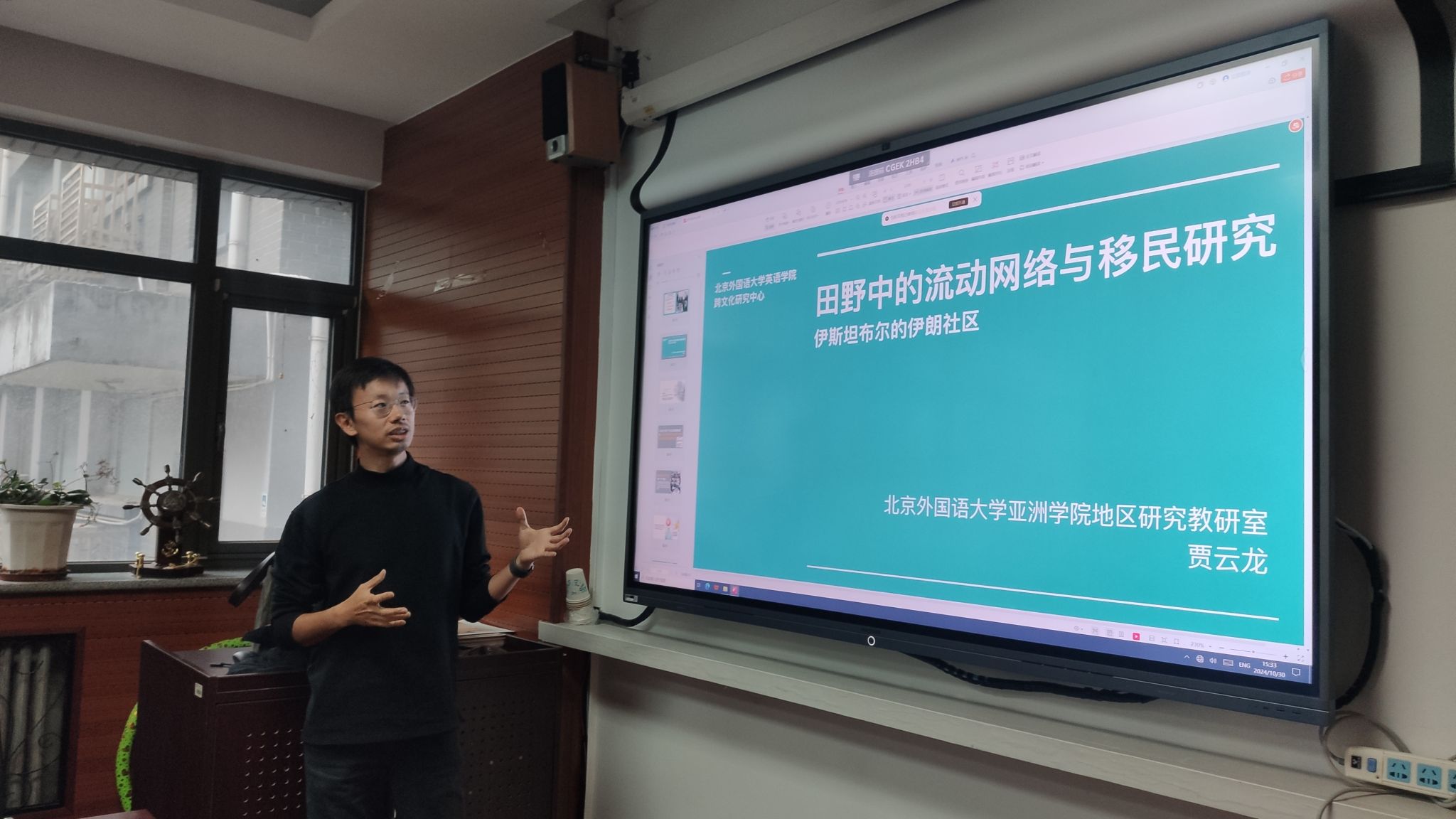 2024年10月30日下午,kaiyun登录中国入口登录亚洲学院地区研究教研室老师贾云龙博士应kaiyun登录中国入口登录跨文化研究中心邀请,做了题为“田野中的流动网络与移民研究:伊斯坦布尔的伊朗社区”的线下学术讲座。讲座由kaiyun登录中国入口登录跨文化研究中心主任刘杨博士主持,kaiyun登录中国入口登录及外系师生共同聆听了本次讲座。