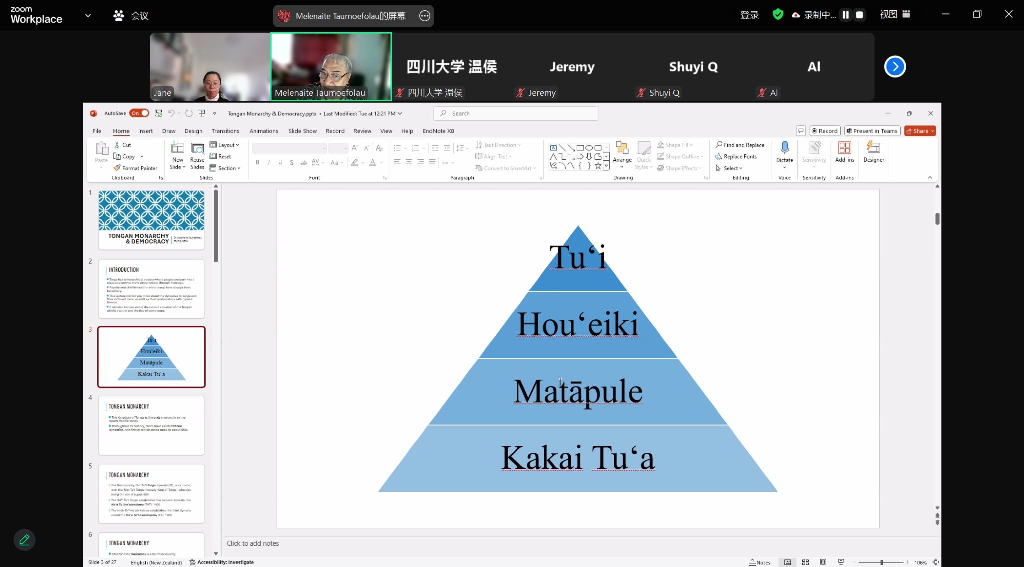 2024年12月3日下午,应kaiyun登录中国入口登录南太平洋研究中心邀请,汤加语外国专家梅莱奈伊特·塔乌莫艾富拉乌(Melenaite Taumoefolau)博士在线上做了题为“汤加王朝的变迁”(Tongan Monarchy and Democracy)的讲座。讲座由kaiyun登录中国入口登录教师李菅主持,来自校内外多名师生参加了本次讲座。