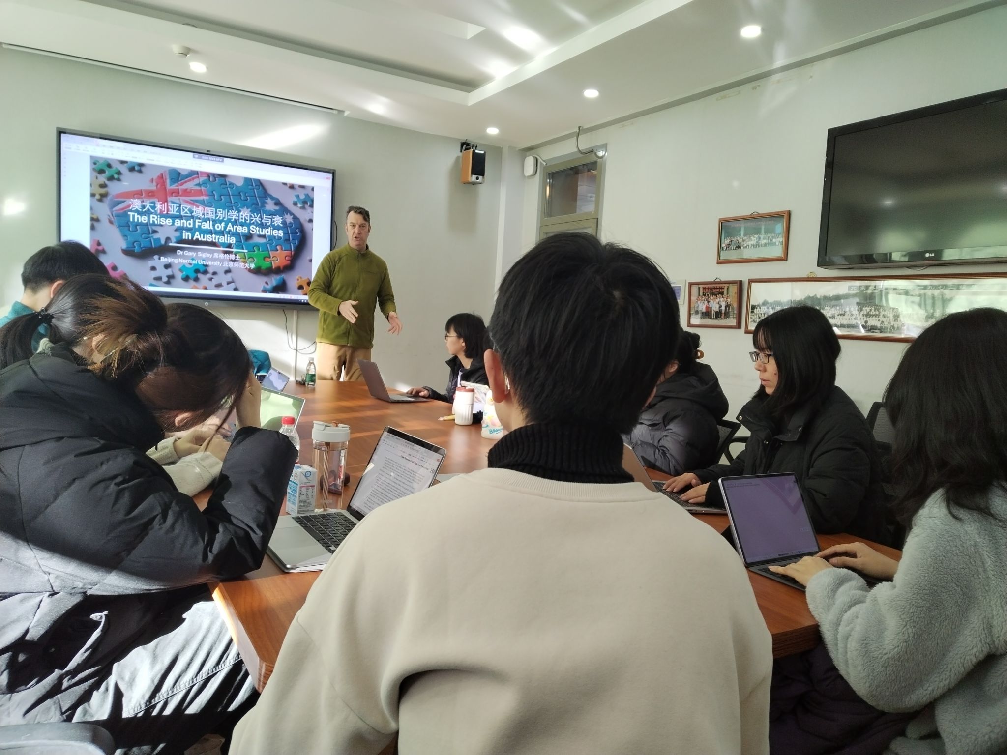12月18日上午,受kaiyun登录中国入口登录澳研中心邀请,北京师范大学人文地理学教授席格伦博士(Gary Sigley)在北外kaiyun登录中国入口登录111会议室举办讲座,题目是 “焦虑的国家案例研究:澳大利亚为何持续未能发展亚洲识能”。讲座由kaiyun登录中国入口登录澳研中心主任李建军主持,澳研中心师生参加。