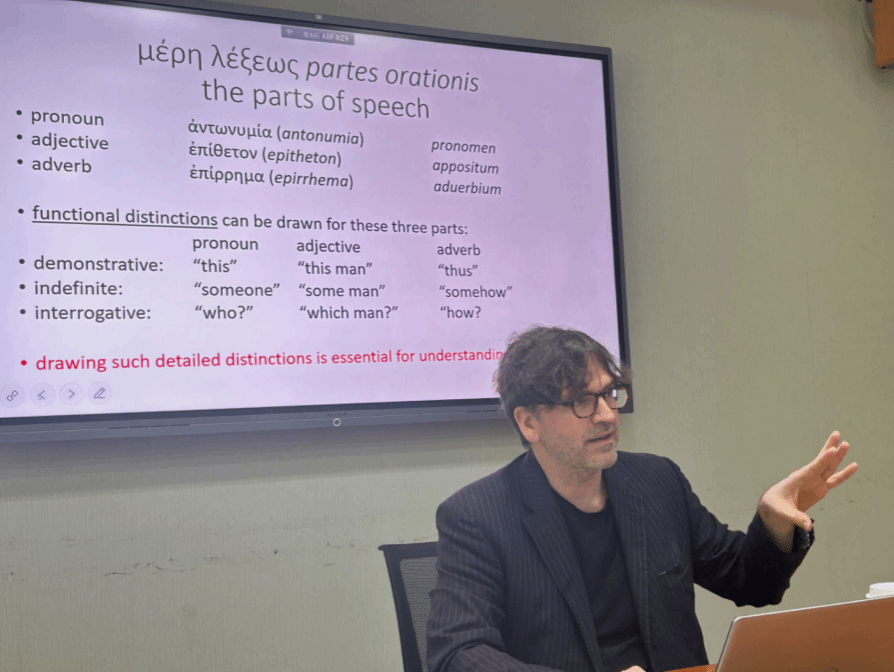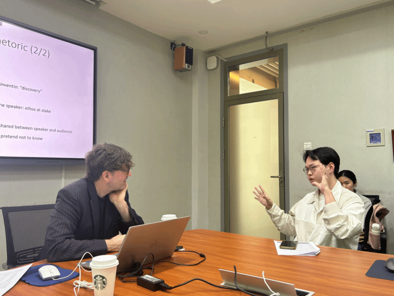 韦斯博士专攻古希腊罗马修辞学、古典诗歌、古典文学理论的研究,在此次的讲座中,他以“古希腊罗马人如何发明并定义‘修辞学’”为切入点,系统梳理了西方古典修辞学核心术语的起源与发展,指出修辞学不仅是语言表达的技艺,更是理解西方文学传统与思想史的重要工具。讲座内容涵盖古希腊语和拉丁语的词类划分、修辞学的三大类型,以及隐喻(metaphor)、转喻(metonymy)、首语重复(anaphora)、交错配列(chiasmus)等经典修辞手法。韦斯博士认为,这些术语不仅是分析古典文本的钥匙,也深深嵌入现代西方语言的结构之中,如广告中的说服策略、政治演讲的逻辑框架,乃至日常对话的叙事技巧,都离不开修辞学的基因。在提问环节,听众围绕“修辞学如何影响当代跨文化沟通”、“数字时代修辞术的演变”等议题踊跃提问,现场讨论热烈。
