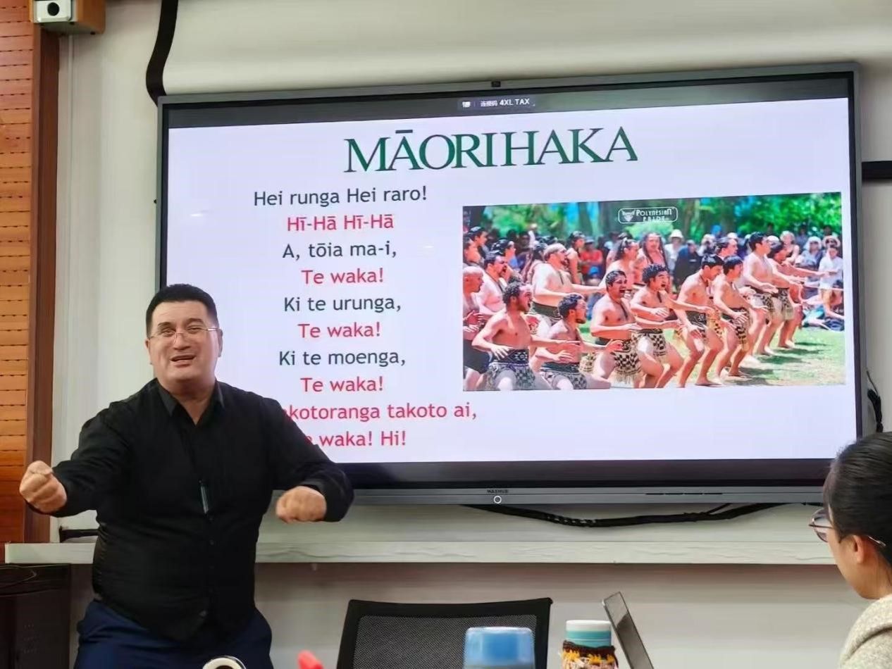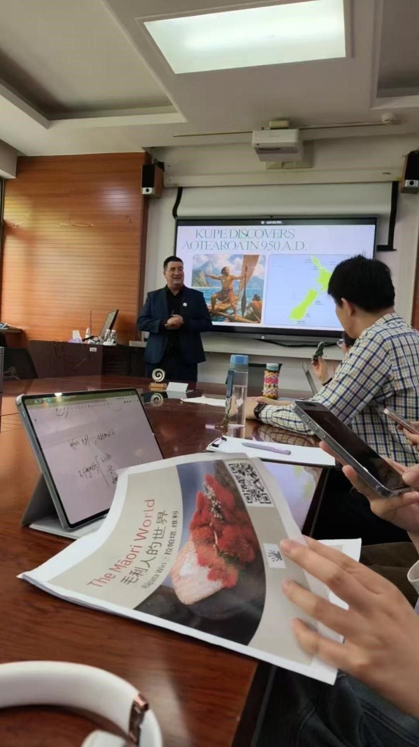 2025年4月24日举办第四场讲座,题为“科技赋能与毛利语的未来图景”。在该讲座中,Wiri博士展望了毛利语在21世纪的未来,特别关注了数字技术如何成为语言复兴的新引擎。Wiri博士详细介绍了新西兰在利用毛利电视台(Māori Television)、语言学习移动应用以及人工智能(AI)等工具推动毛利语传播与教育方面的创新实践。讲座引发了师生们对教育体系未来演变方向、以及AI技术对语言文化传承模式可能产生深刻影响的思考。