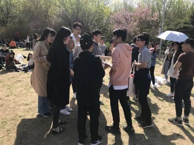 ——整个活动分三个部分:1. 自我介绍 2. 游戏环节 3. 游园赏花。自我介绍环节让各学校研会之间有了初步了解。游戏环节包括“两人三足”,“五毛一块”,撕名牌和狼人杀,很好地带动了大家的活跃性和积极性。游戏环节是大家最尽兴的一个部分。“两人三足”主要考验小伙伴之间的默契度,你追我赶,大家全力角逐,最后获胜的小组得到了来自北航的纪念物——小猴子。在“五毛一块”的游戏过程中,大家都绞尽脑汁计算,各小组之间互相争夺成员,淘汰就在一瞬间,男生们在这个游戏中起到了“中流砥柱”的作用,都是各组的“香饽饽”。这个游戏让我们不再局限于日常的语言学习,设计研究等专业方面的学习,更贴近生活,也是对我们计算能力的考验。