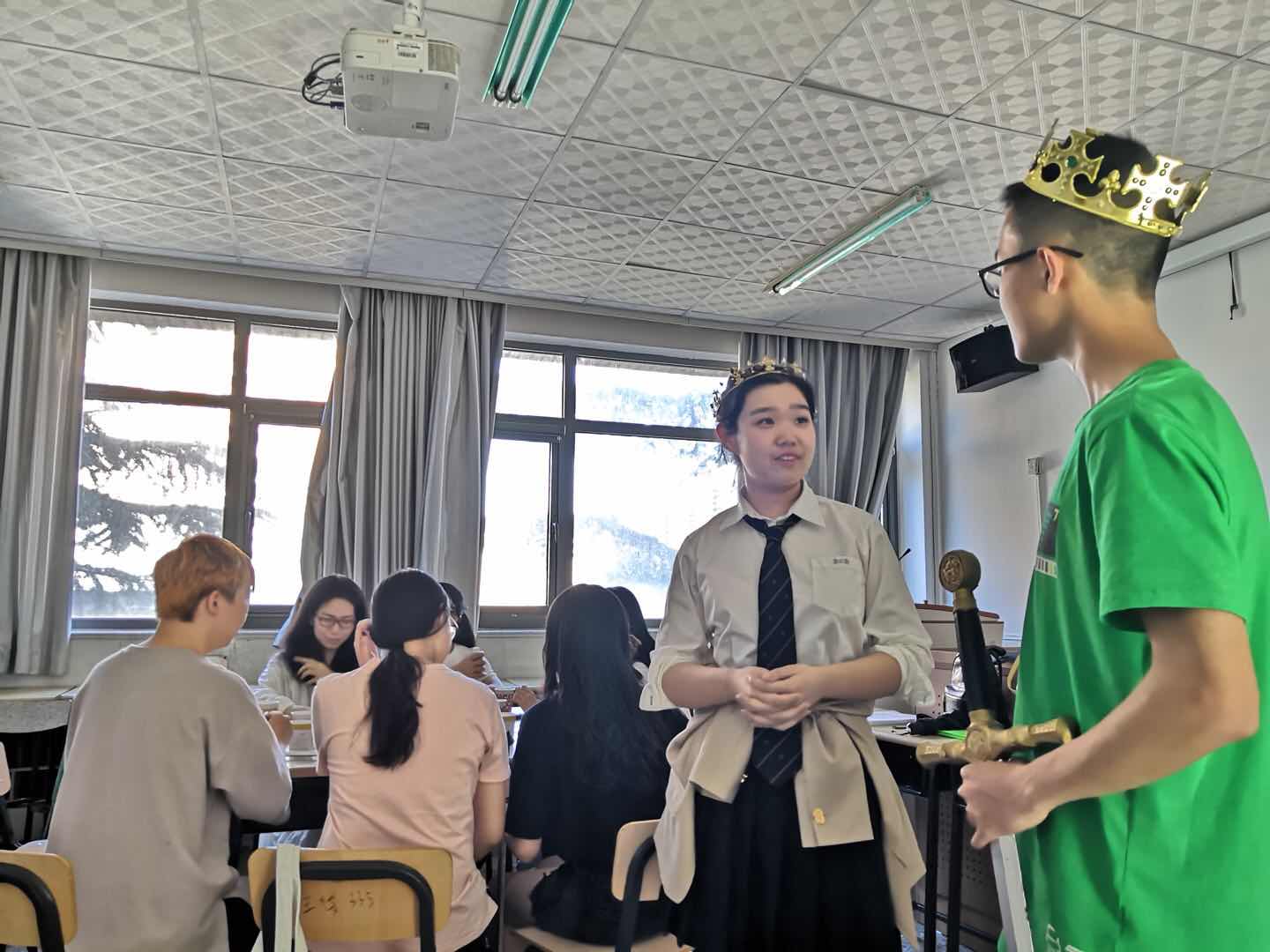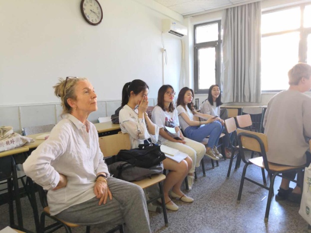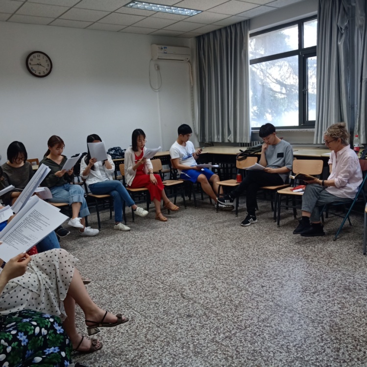 赛芙博士目前为爱尔兰三一学院戏剧系助理教授兼爱尔兰SJ戏剧公司艺术总监。她致力于爱尔兰经典戏剧的发展与传播,在戏剧教学、研究与导演方面都具有丰富的经验。在第一期工作坊中,我院1806班本科生刘畅、陈翎雨、陈琼洁、罗筱晓、王倩茜、林启和、陈云龙、马竞怡、陈姝颖、李明越、李越、蒋枫奕、成佩雯、陈邵逐颜、赵偲琪、杨一凡、曹韫珠、骆砚秋、王赫璘、李越、陈禹含、高玉洁为赛芙博士表演了他们根据亚瑟王传奇改编的英文短剧“The Split of the Round Table”(《圆桌骑士的分裂》),他们的生动演绎和丰富的想象力得到了赛芙博士的高度评价,同时她也为剧组同学提出了不少宝贵建议,使同学们了解了使用言语来呈现肢体暴力,以此增强短剧戏剧性的有效办法。