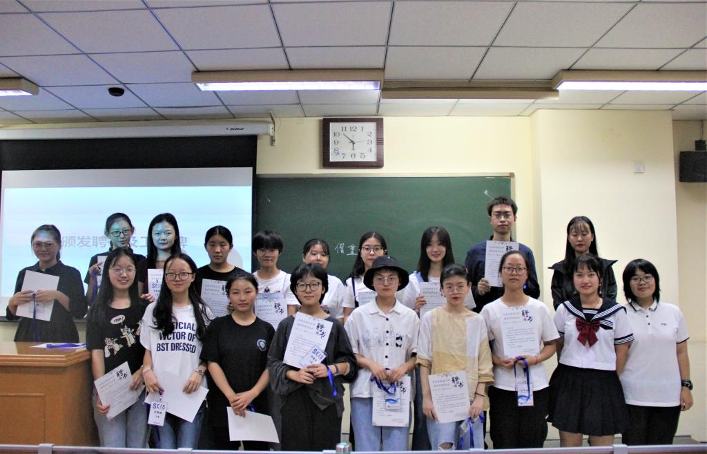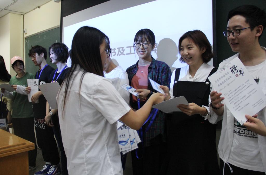 最后,大会的高潮来临,各部门部长将为新成员颁发聘书和工作证。各部门部长及部员依次上台,新干事们手持聘书和工作证与部长们合影留念,笑脸中洋溢着对未来工作的期许。