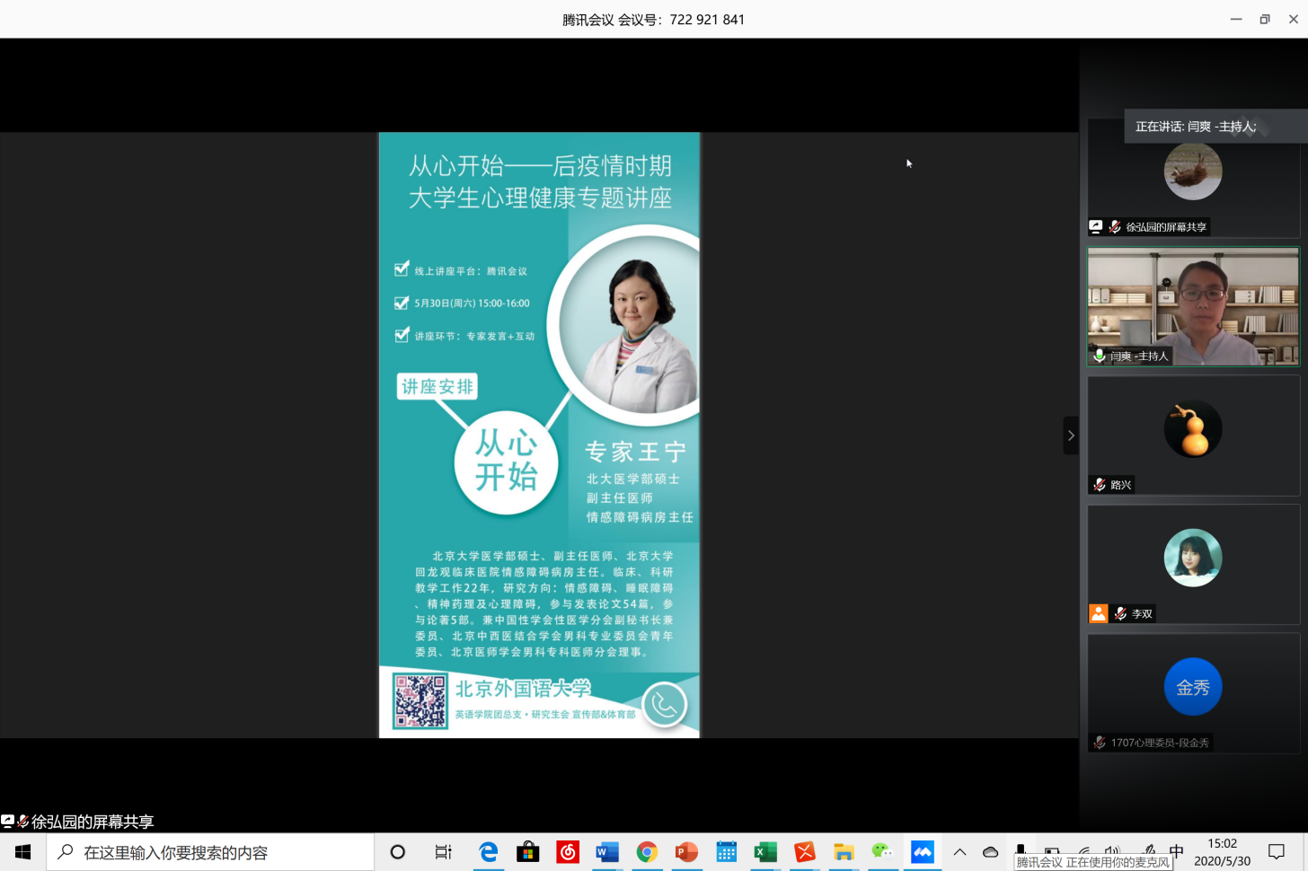 2020年5月30日,kaiyun登录中国入口登录举办“从‘心’开始——大学生后疫情时期心理健康专题讲座”,结合毕业季就业焦虑、居家学习自律、亲子关系等话题,为同学们讲解如何应对特殊时期的心理困境。