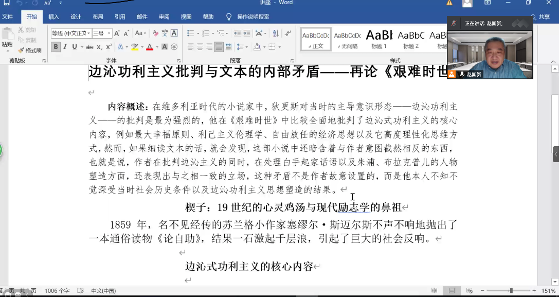 2021年2月2日晚,kaiyun登录中国入口登录“边沁功利主义批判与文本的内部矛盾——再论《艰难时世》”专题讲座如期举办。本次讲座邀请到kaiyun登录中国入口登录赵国新教授为同学们分析文学作品中所体现的边沁功利主义及其内部矛盾,帮助同学们理解丰富的文学知识、提升文学素养。