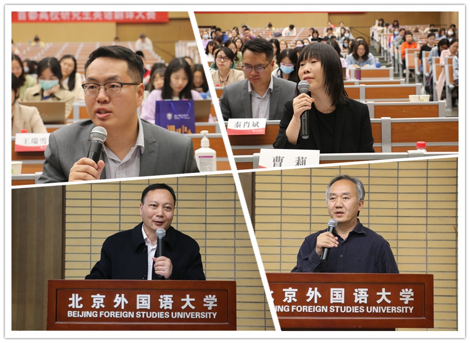 每轮比赛结束后,评委对选手的当场表现给予专业点评。老师们对选手的出色表现给予了肯定,也指出了译文中的问题和需要改进的地方。在最后的总点评环节中,朱源老师称赞了选手们的沉着冷静,指出了准确与流畅在翻译中的重要性;李长栓老师指出,做好翻译要注重语言、知识、技能三个方面的积累。