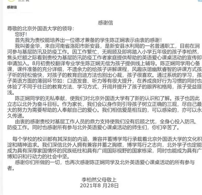 活动结束后,家长孩子对志愿者的出色教学能力和认真态度予以肯定,并表达由衷的感激。其中,参与基层防汛和防疫工作的李柏然父母向kaiyun登录中国入口登录致感谢信,赞扬志愿者别出心裁的教学方式以及kaiyun登录中国入口登录深厚的文化积淀和崇高的精神追求。