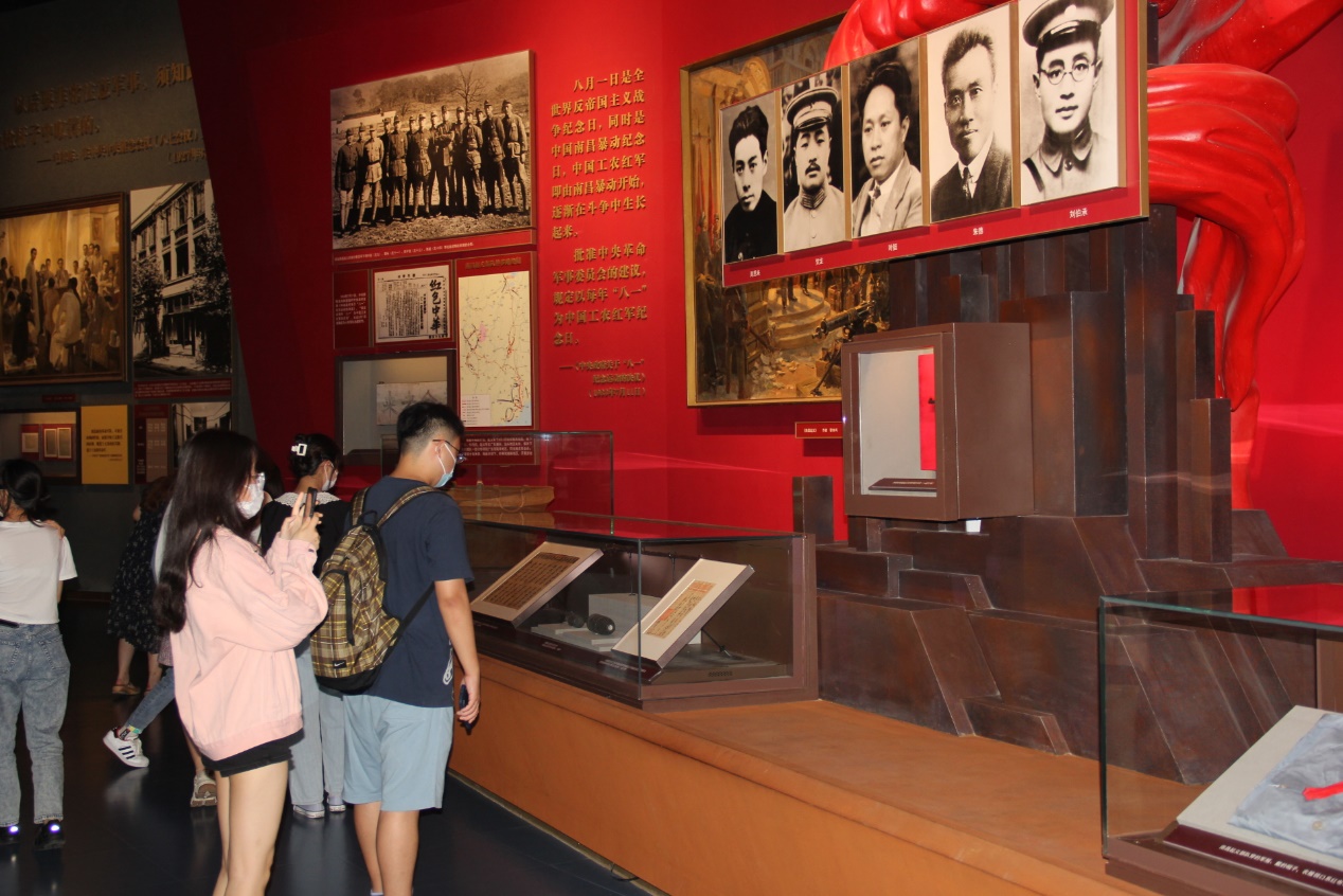 展览馆按时间顺序布置展厅,师生沉浸在党的百年历史中,感受到共产党人救国救民的热情和建设国家的理想,一代代共产党人前仆后继,奉献青春,施展才华。在参观过程中,师生展开热烈讨论。2018级预备党员王昊同学表示,中国共产党于风雨飘摇、民族危亡之际诞生,从一开始就以为中国人民谋幸福、为中华民族谋复兴为己任。在展览馆中,看到了无数为救亡图存而奔走的共产党人,倍感鼓舞。在物质条件比当年好得多的新时代,更应该像他们一样,坚守党员的初心和使命,奋发有为,砥砺前行。2019级发展对象骆砚秋同学表示,回望党的光辉历程,深受震撼和感动。透过一叠叠文件,一件件旧物,一幅幅画像,一尊尊雕塑,仿佛穿越时空,去感受波澜壮阔的历史脉动。在回顾党的历史中坚定信念、启迪智慧,并将以更加昂扬的姿态满怀信心迎接未来!