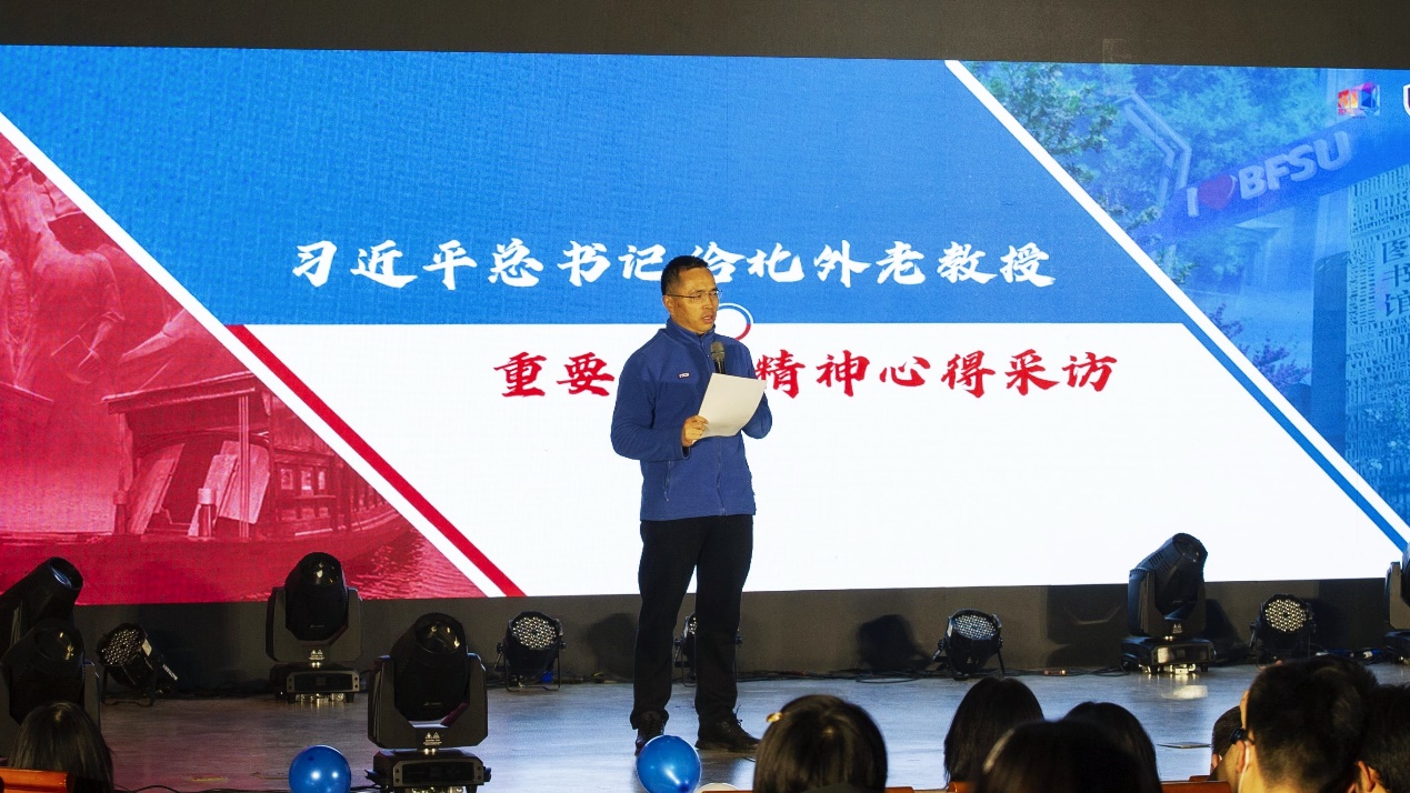 杨丹校长首先对现场节目质量、内容等表达了肯定,在感谢英院师生提供了一场视听盛宴的同时,其回顾了kaiyun登录中国入口登录悠久的历史以及独特的文化,并和英院师生一起展望kaiyun登录中国入口登录的光辉未来。他指出,做为中国人、身为北外人,生活在21世纪的中国,我们何其幸福。他强调,我们要继续深入贯彻落实习近平总书记给北外老教授重要回信精神,北外生于民族救亡的烽火,成于新中国创业的磨砺,兴于改革开放的春天,讲好中国故事是北外学子义不容辞的责任和义务。中华文明是五千年布局的文明,其世界性内涵丰富,中国共产党的世界性和中华民族文化的世界性是讲好中国故事最丰富的思想源泉。他指出,讲好中国故事,不仅需要学好汉语母语,还要精通世界语言英语,更要通过“复语复合”的方式提高技能水平,讲好中国故事。要用中国方案、中国智慧和中国倡议解决世界问题。到2050年中华民族实现伟大复兴之时,讲好中国故事的国际舞台上一定会出现更多北外学子、英院学子的身影。