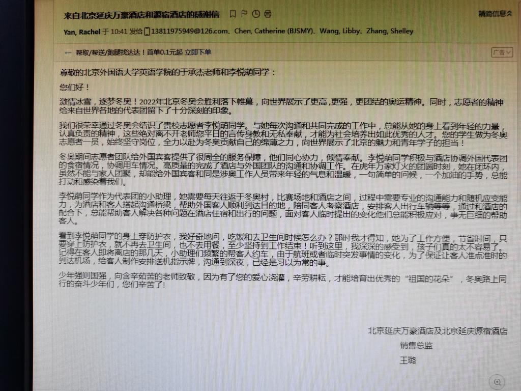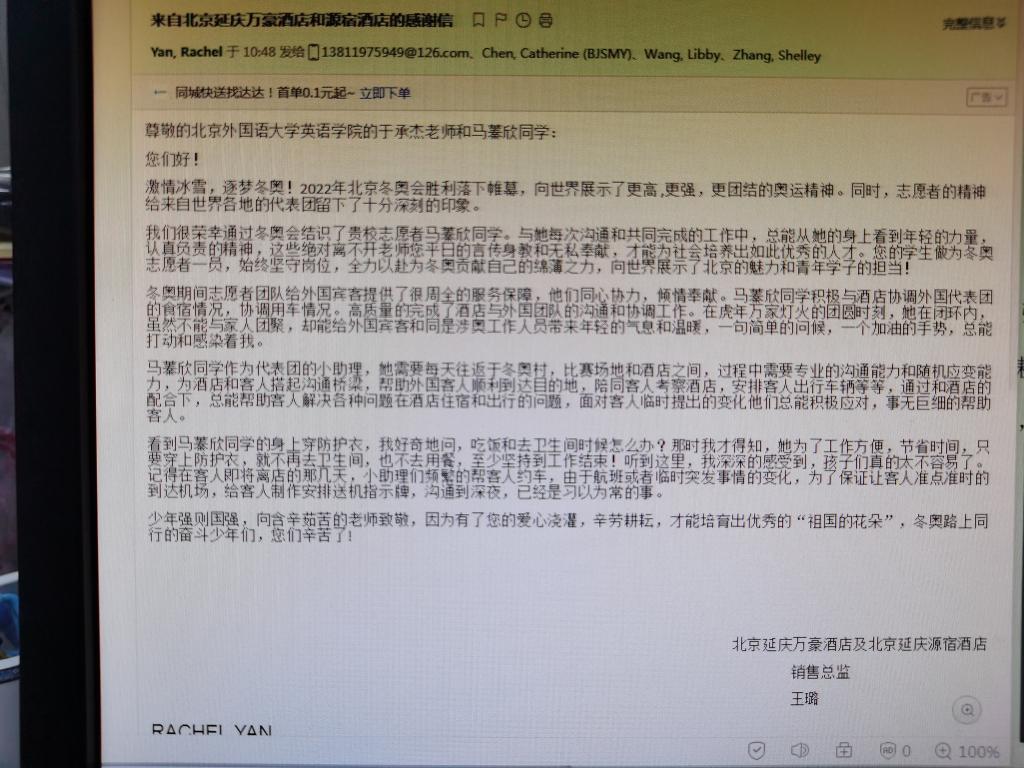 近日,北京延庆万豪酒店和源宿酒店向kaiyun登录中国入口登录发来感谢信。对我院2019级本科生李悦萌、马蓁欣同学表示感谢,对我校冬奥志愿者在服务期间的工作表现给予高度评价。