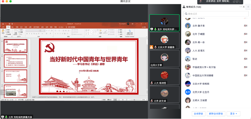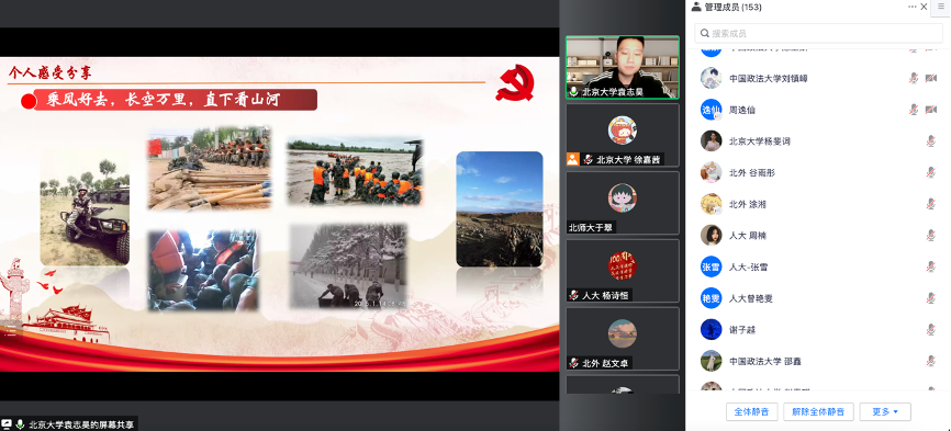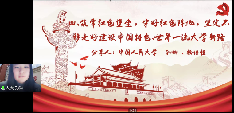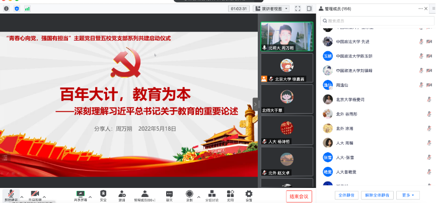 在各支部的分享结束后,五个支部支委进行了支部共建经验交流,探索赋能基层党支部工作的新模式。大家一致认为,不同背景的五个支部强强联合,定会产生“1+1+1+1+1>5”的效果。本次共建活动中,不同支部党员结合自己学校的红色资源、学科特色,通过在线交流研讨,打造了党员间交流沟通的新天地、支部间教育学习的新窗口、高校间博采众长的新渠道。通过本次共建活动让青年党员真正受益,进一步学习贯彻习近平总书记的重要讲话精神、了解党的光辉历史、感悟党的初心使命、领会党的创新理论、体认党的精神谱系、传承党的红色基因。本次支部共建活动激励党员同学明德立志,共担复兴重任,共谱时代华章。