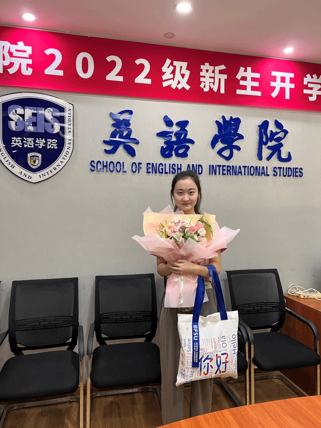 王明欣对王瑾积极报名参军入伍表示赞赏,嘱咐王瑾在军营中照顾好自己,坚持学习,刻苦训练,在部队里成长为刚毅果敢、兼具家国情怀、全球视野和专业本领的复合型人才,彰显北外学子的风采。孟庆琨及各位辅导员也和王瑾交流畅谈,希望王瑾将英院人的精神风貌带进军营,也希望王瑾的事迹能带动更多的英院学子积极承担青年责任,书写无悔、灿烂的青春诗篇。