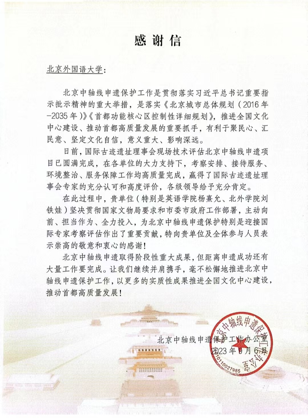 北京中轴线申遗保护工作办公室向我院发来感谢信