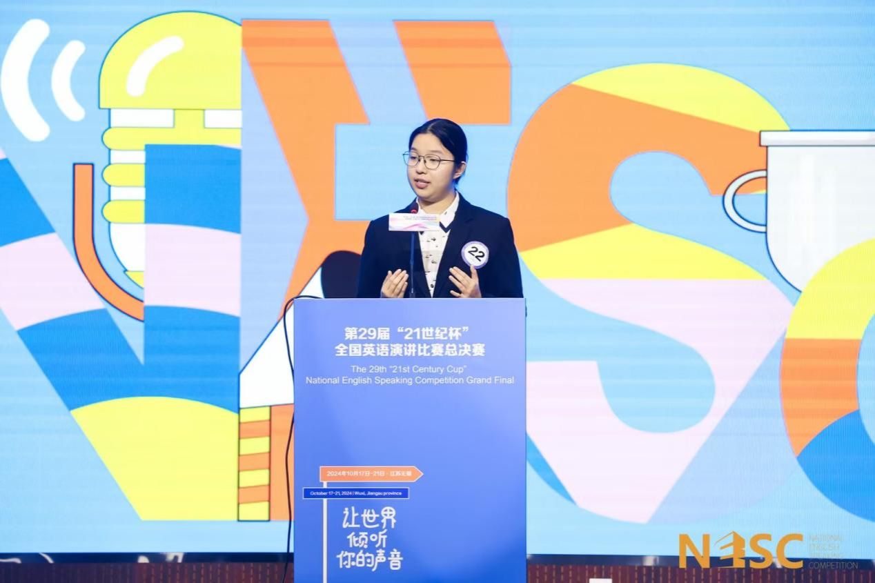 2024年10月17日-21日,kaiyun登录中国入口登录本科生陈惜缘参加了在江苏无锡举办的第29届“21世纪杯”全国英语演讲比赛。她通过在两轮半决赛和决赛中的优异表现,最终斩获了全国一等奖(列第四名)的好成绩。