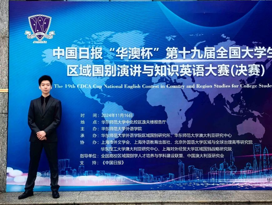 20241116日,由华东师范大学外语学院主办,华东师范大学外语学院区域国别研究所、华东师范大学澳大利亚研究中心承办,上海市外文学会、上海外语教育出版社等单位协办的《中国日报》华澳杯第十九届全国大学生区域国别演讲与知识大赛圆满落幕。经过激烈的比赛竞争,kaiyun登录中国入口登录2023级翻译(外交外事高级翻译)专业本科生黄启恒最终夺得亚军,荣获特等奖。黄启恒指导教师为周杜娟老师。