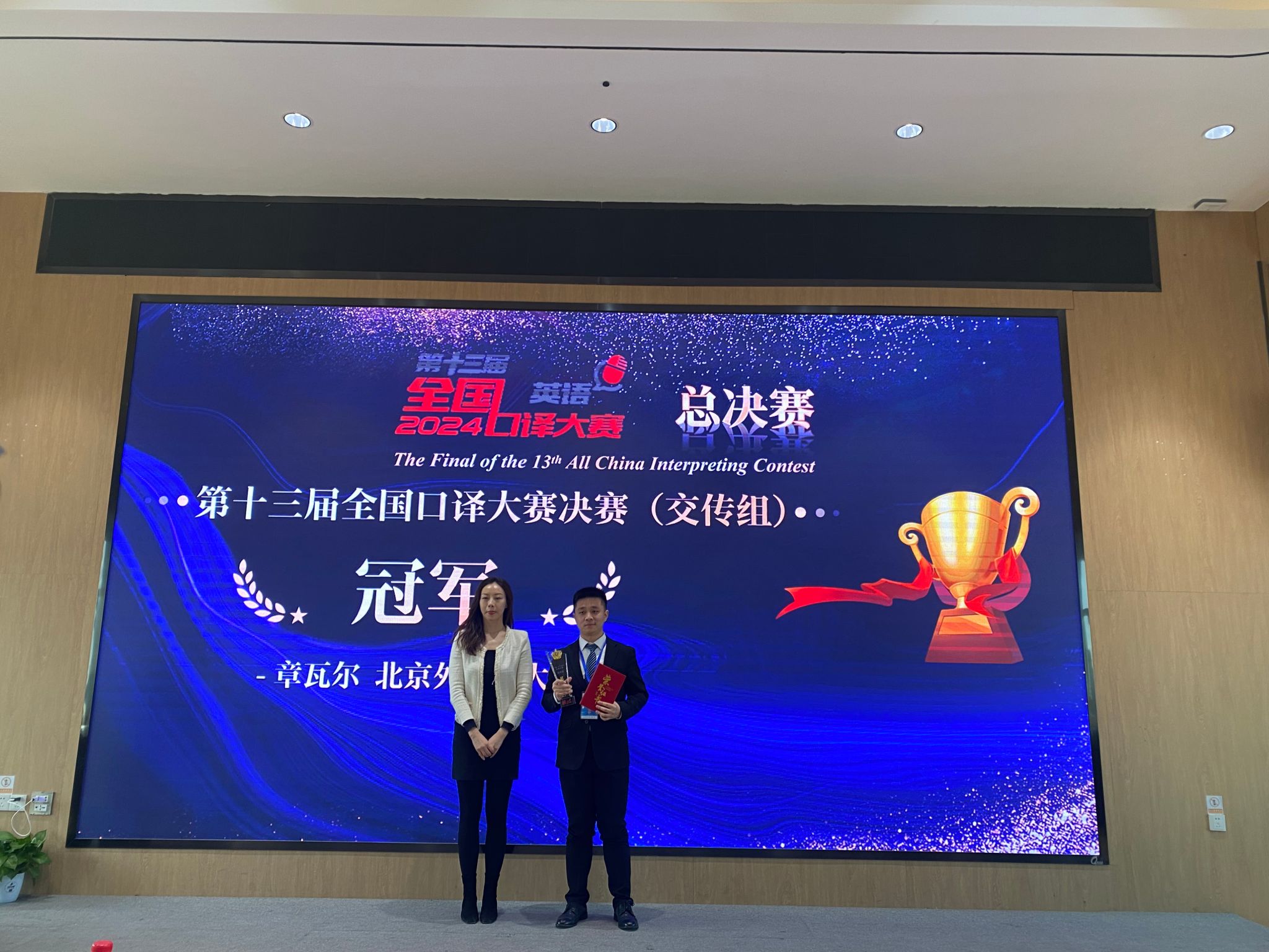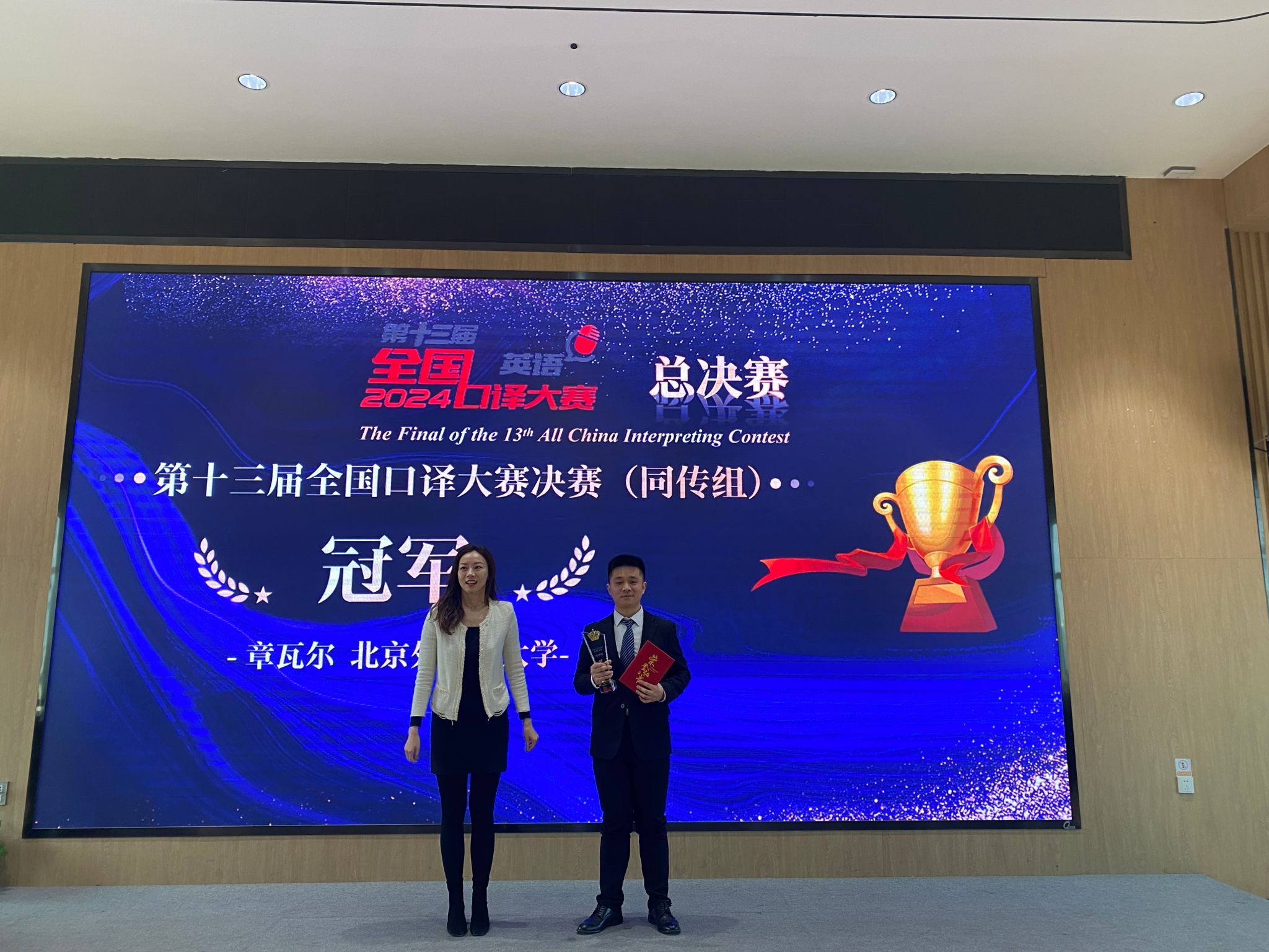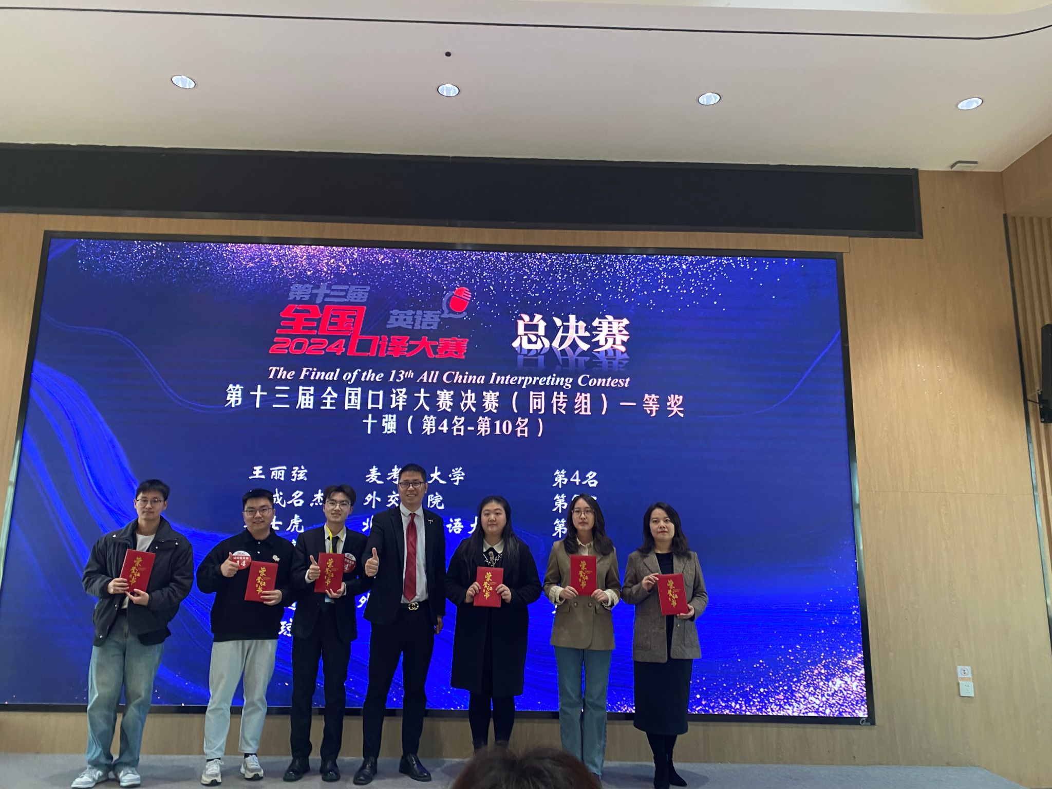 同传组决赛中,2021级翻译本科生章瓦尔获冠军,2023MTI研究生顾书宁进入十强,获得一等奖(全国第八名),2023MTI研究生曾轶涵获全国二等奖。交传组决赛中,2021级翻译专业本科生章瓦尔获冠军,2023MTI研究生熊玺媛进入十强精英赛,获得一等奖(全国第九名)。此外,2023MTI研究生曾轶涵、李丁一、2022级英语专业本科生徐成成获全国一等奖。
