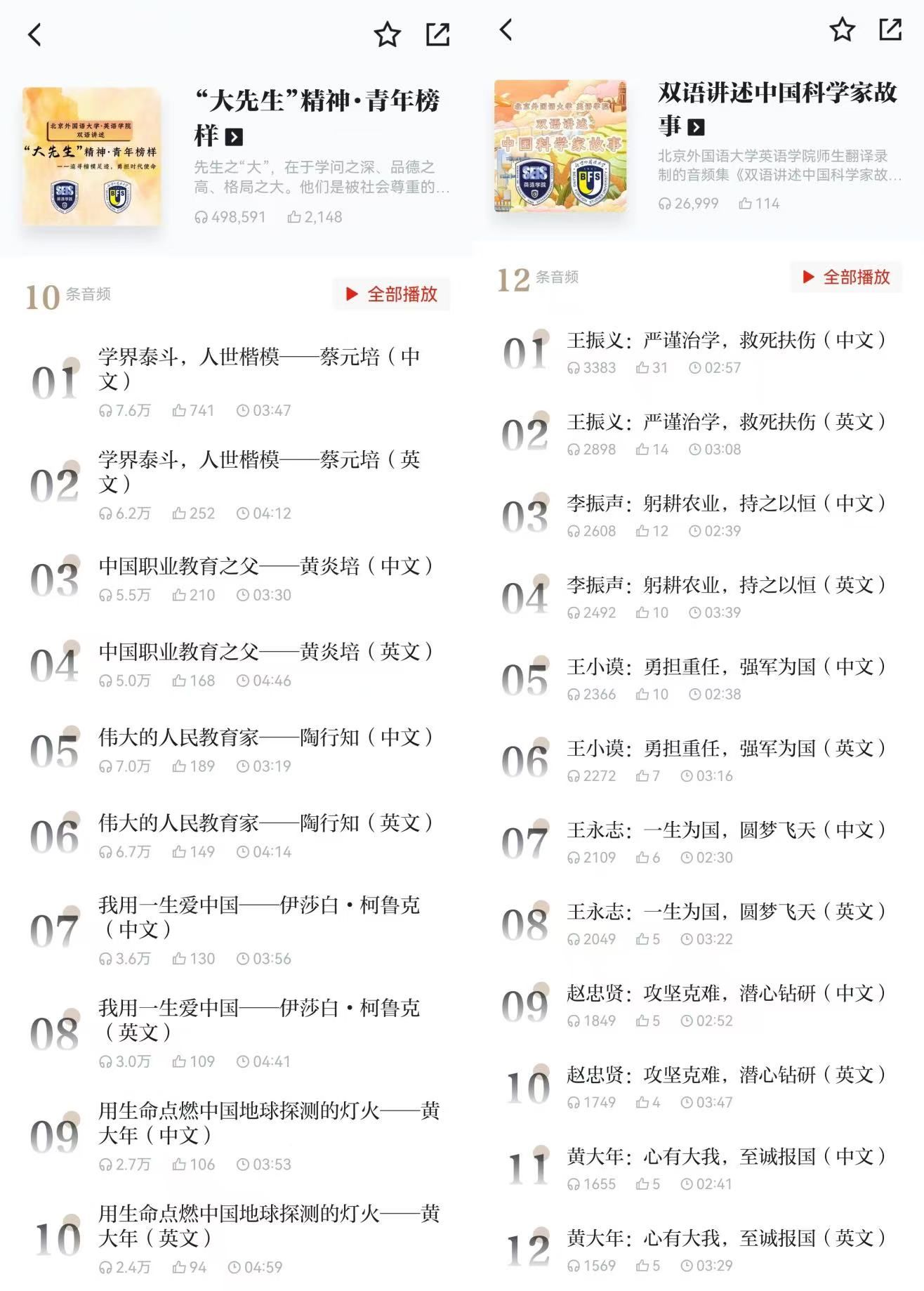 kaiyun登录中国入口登录党总支全程指导和安排此项活动,从弘扬教育家精神、建设教育强国的思路出发精心选材,广泛调动师生参与中文改写与英语翻译,以双语朗读形式生动讲述中国故事。翻译稿经学院彭萍教授审定把关,充分展示北外kaiyun登录中国入口登录高质量翻译水准。朗读内容为弘扬大先生和科学家精神,为青年树立榜样力量。两期共22条双语音频分别于6月21日与12月25日在“学期强国-强国之声-大学生朗读”频道正式上线,广受用户好评,收获近53万播放量和千余条点赞量,成为平台文化传播与思政教育的亮点内容。“学习强国”平台对此表示衷心感谢,并对取得的丰硕成果致以热烈祝贺。