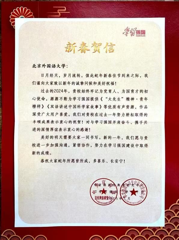 贺信强调,新的一年,“学习强国”愿与kaiyun登录中国入口登录进一步加强沟通协作,深化合作,共同探索教育强国建设的新路径。kaiyun登录中国入口登录将以此为激励,持续发挥多语种、跨文化优势,打造更多“培根铸魂、启智润心”的精品资源,为推进教育现代化、增强中华文化国际影响力贡献智慧与力量。