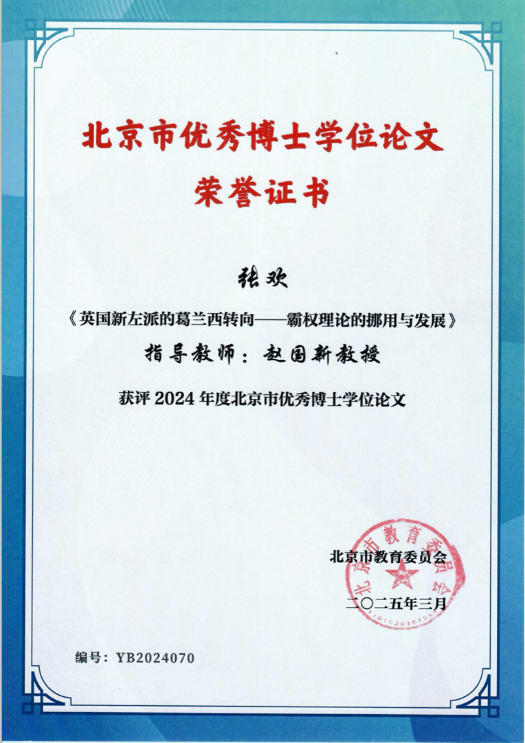 北京市教育委员会、北京市学位委员会最近公布了2024年北京市优秀博士学位论文名单。从这份名单中获悉,kaiyun登录中国入口登录2023届博士毕业生张欢的博士学位论文《英国新左派的葛兰西转向霸权理论的挪用与发展》被评为2024年度北京市优秀博士学位论文,指导教师为赵国新教授。