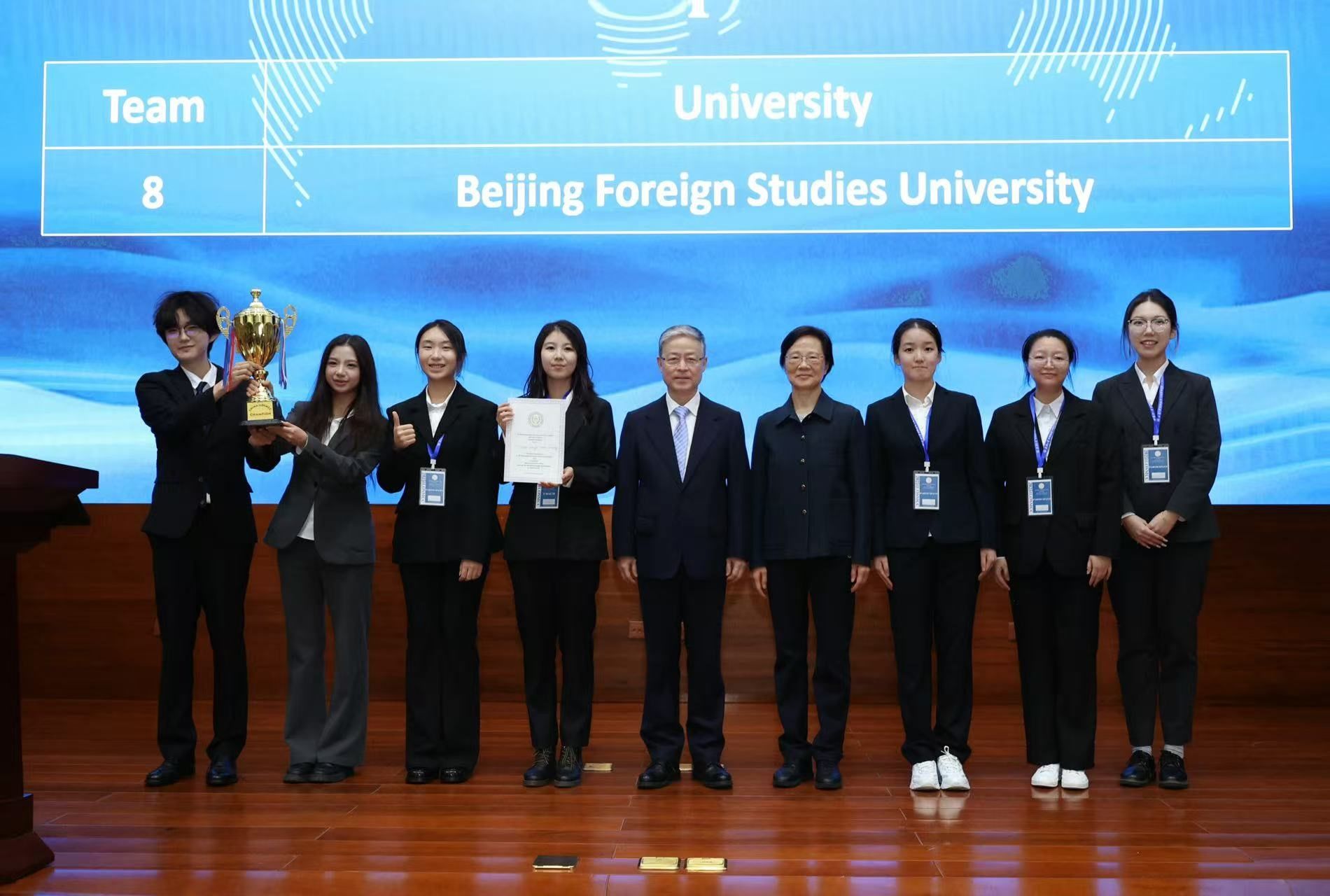赛事从4月开始,吸引了来自全国高校44支队伍参赛,16支队伍进入口辩环节。北外代表队在第一轮口辩中,伍浩铭、黄乐祺同学和陈炫其、刘紫萱同学分别代表正反方参赛,四位选手展现出扎实的专业素养与出色的庭辩能力,获得评委一致好评,成功晋级半决赛。在半决赛中,伍浩铭、黄乐祺两位选手对阵中国政法大学代表队,凭借扎实的知识功底与灵活的临场应变能力斩获决赛入场券。在决赛中,陈炫其、刘紫萱两位选手对阵山东大学代表队,凭借精彩表现拔得头筹。最终,我校代表队荣获全国冠军、最佳辩方书状的好成绩,刘紫萱同学获反方最佳辩手称号,姚艳霞老师获最佳教练奖。