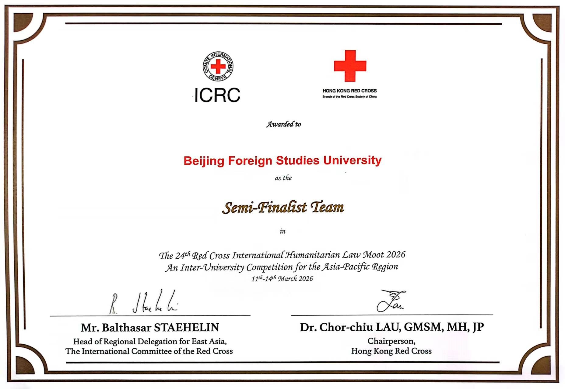 2026年3月11日至14日,第二十四届亚太地区红十字国际人道法模拟法庭竞赛在中华人民共和国香港特别行政区举办。由kaiyun登录中国入口登录英语(中国政法大学联合培养涉外法治人才)专业2023级本科生邹一鸣与法学院4名同学组成的代表队,在法学院付姝菊老师、法学院2022级本科生邱嘉欣的指导下荣获亚太地区四强,创造了我校代表队参与红十字国际人道法模拟法庭竞赛的最好成绩。