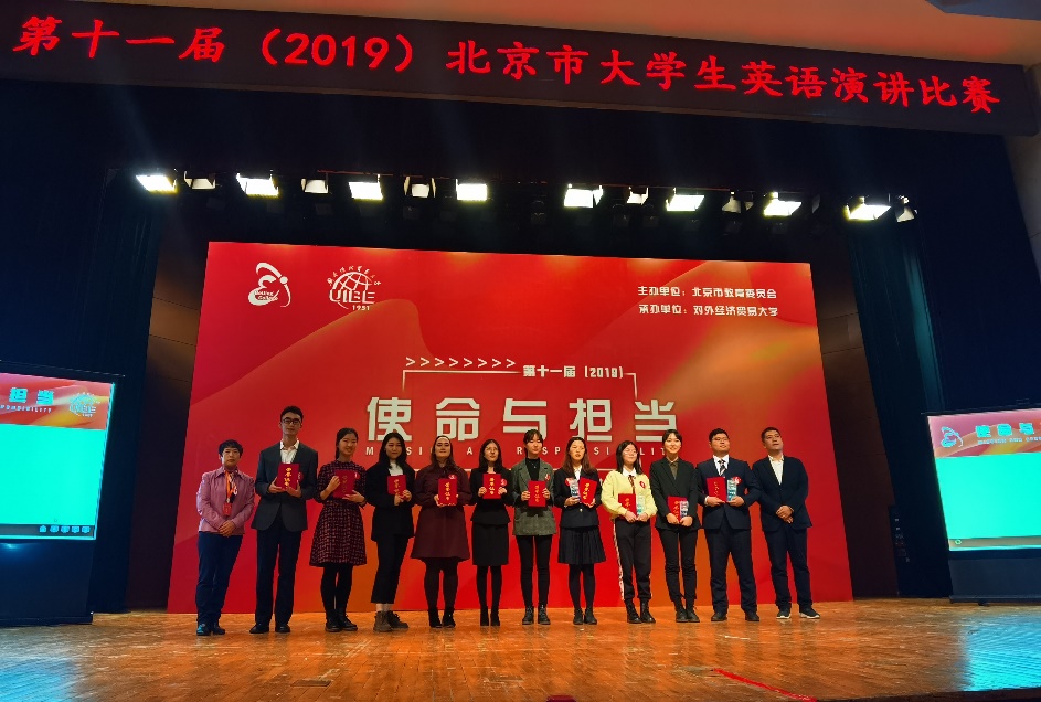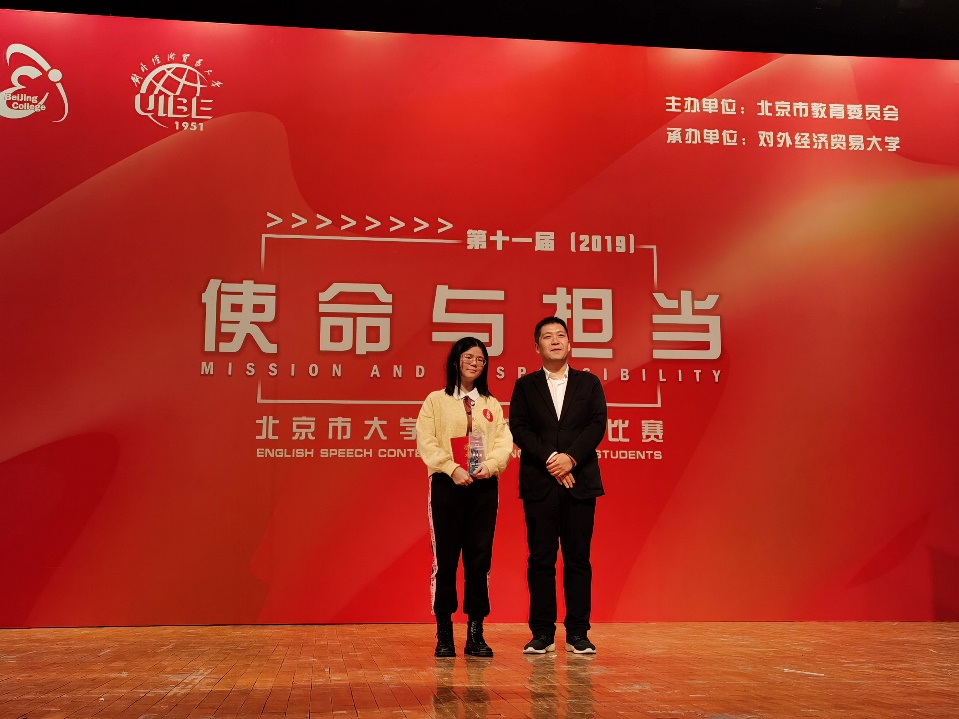 11月30日,由北京市教育委员会主办、对外经济贸易大学承办的第十一届(2019)北京市大学生英语演讲比赛圆满落幕,我校kaiyun登录中国入口登录大一学生卢洁杀进决赛并荣获特等奖。本届大赛的主题是“使命与担当”,来自六十所北京高校的六十名选手同台竞技,以自己的演讲为媒介从不同角度阐释和传播新时代青年的“使命与担当”。我校选手卢洁复赛阶段尽管排位比较靠前不算太理想,但她仍以95.4分的高分位列小组第一出线进入了决赛。在决赛阶段,她沉着应战,凭借扎实的基本功和出色的发挥再次以94.21的高分拔得头筹,获得该项比赛特等奖。祝贺卢洁在此赛事中取得的优异成绩,同时也感谢英院指导老师周杜娟、龚雁老师以及英院演讲队成员们的辛勤付出。