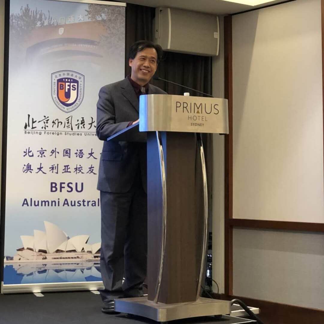 ——4月11日晚上,代表团参加了我校澳大利亚校友会成立一周年纪念会暨《澳大利亚发展报告》(2017版)悉尼发布会。纪念会上,孙有中宣读了彭龙校长的贺信并发表了讲话,对澳大利亚校友会成立一周年表示祝贺,对校友会一年来所开展的活动表示赞赏。中国驻悉尼总领馆教育参赞牛文起作为校友代表在纪念会上发言,感谢母校的培养和关心,希望母校发展得越来越好。孙有中代表我校向我校校友、中国银行澳大利亚地区行长、澳大利亚中国总商会会长陈怀宇颁发了北外澳大利亚校友会名誉会长的聘书。我校校友代表和北京大学、中国人民大学、北京理工大学、东南大学、复旦大学等15所国内大学澳大利亚校友会代表以及新华社、中新社、人民网等媒体代表近百人参加了纪念会。