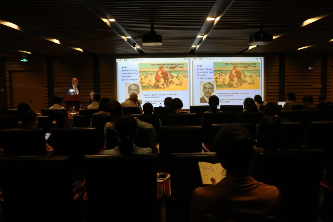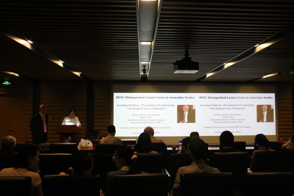 ——5月15日晚7点“北外澳研大讲堂”(BFSU Distinguished Lecture Series in Australian Studies)第一讲在北外图书馆四层学术报告厅隆重举行,我校客座教授、澳大利亚社会科学院院士、澳大利亚人文科学院院士、迪肯大学荣休教授大卫•沃克(David Walker)作了题为“澳美关系:100年的伙伴情谊?”(The Australia US Relationship: One Hundred Years of Mateship?)的讲座。讲座由kaiyun登录中国入口登录澳研中心主办,kaiyun登录中国入口登录副校长孙有中教授主持。