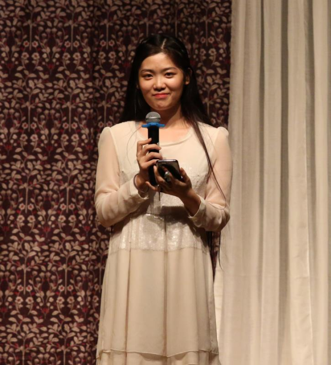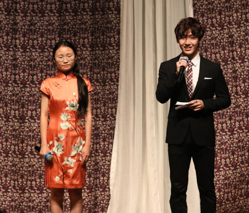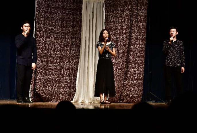 当晚的节目由英院15级本科生薛雨彦与胡馨友主持,节目中的双语版中国古风歌曲《东风志》为绿萝剧社负责人邵雪萍指导的国家级大学生创新项目“中国古风歌曲的翻译与传播”的阶段性成果,由来自kaiyun登录中国入口登录、国际新闻传播学院、中国语言文学学院的中外学生共同演唱,中英文歌词的和谐交织与演唱者的动人歌喉令观众掌声雷动。